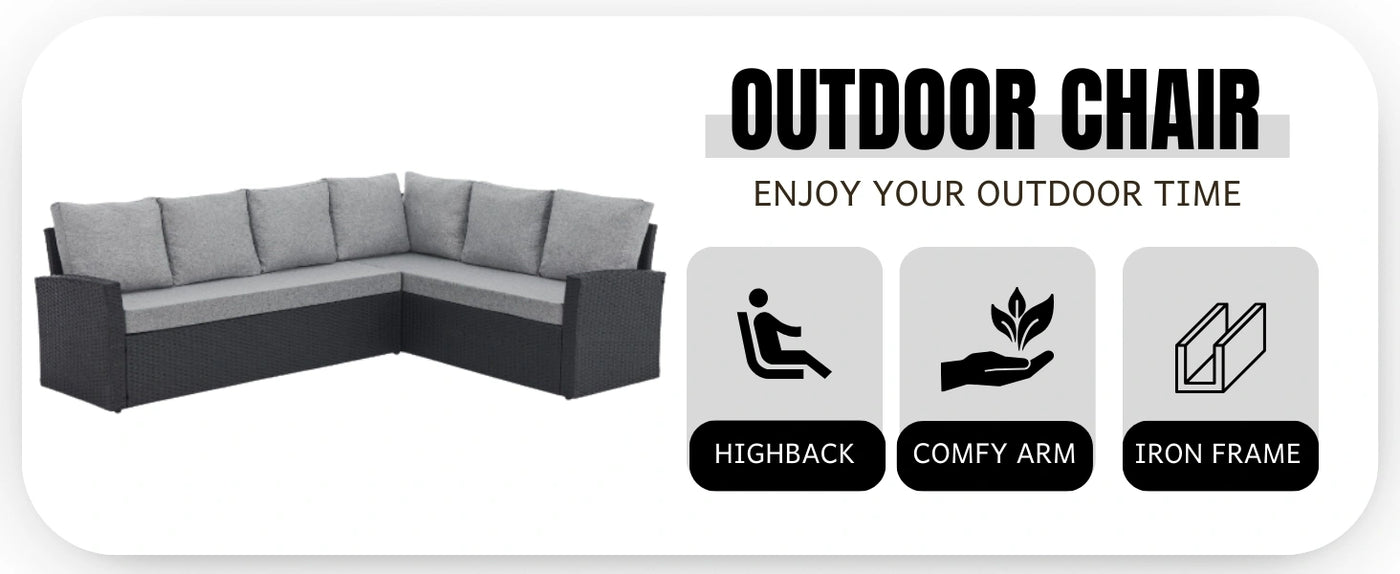 Elevate your outdoor living with this stunning 6-piece Wicker Rattan Furniture Set, thoughtfully crafted to bring modern style, lasting comfort, and practical elegance to your garden, patio, porch, or poolside. With its sleek frame and soft cushions, this set instantly adds a touch of sophistication to any setting, whether you're hosting guests or simply unwinding after a long day. Built with a durable handwoven wicker exterior over a rust-resistant powder-coated metal frame, this sectional set is made to withstand all weather conditions while retaining its beauty season after season. The ergonomic corner sofa design provides deep, cozy seating with thick, plush cushions that promise all-day comfort. The removable, washable cushion covers ensure easy cleaning and maintenance, so your outdoor oasis always looks fresh and inviting. At the center of it all is a matching glass-top coffee table, perfect for holding drinks, snacks, or décor, offering the ideal space for morning coffees or evening conversations under the stars.