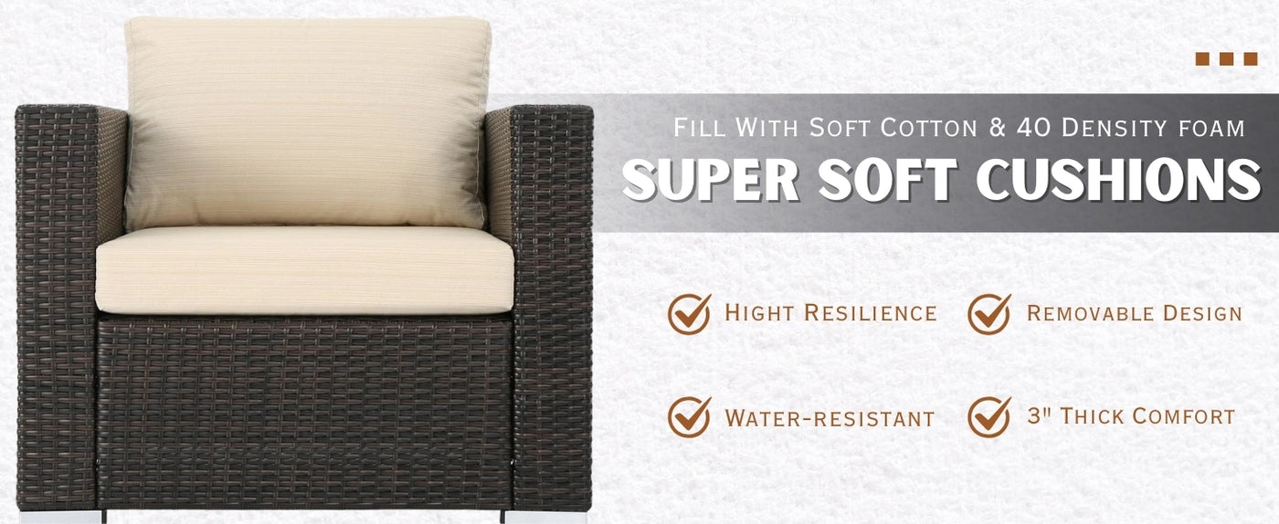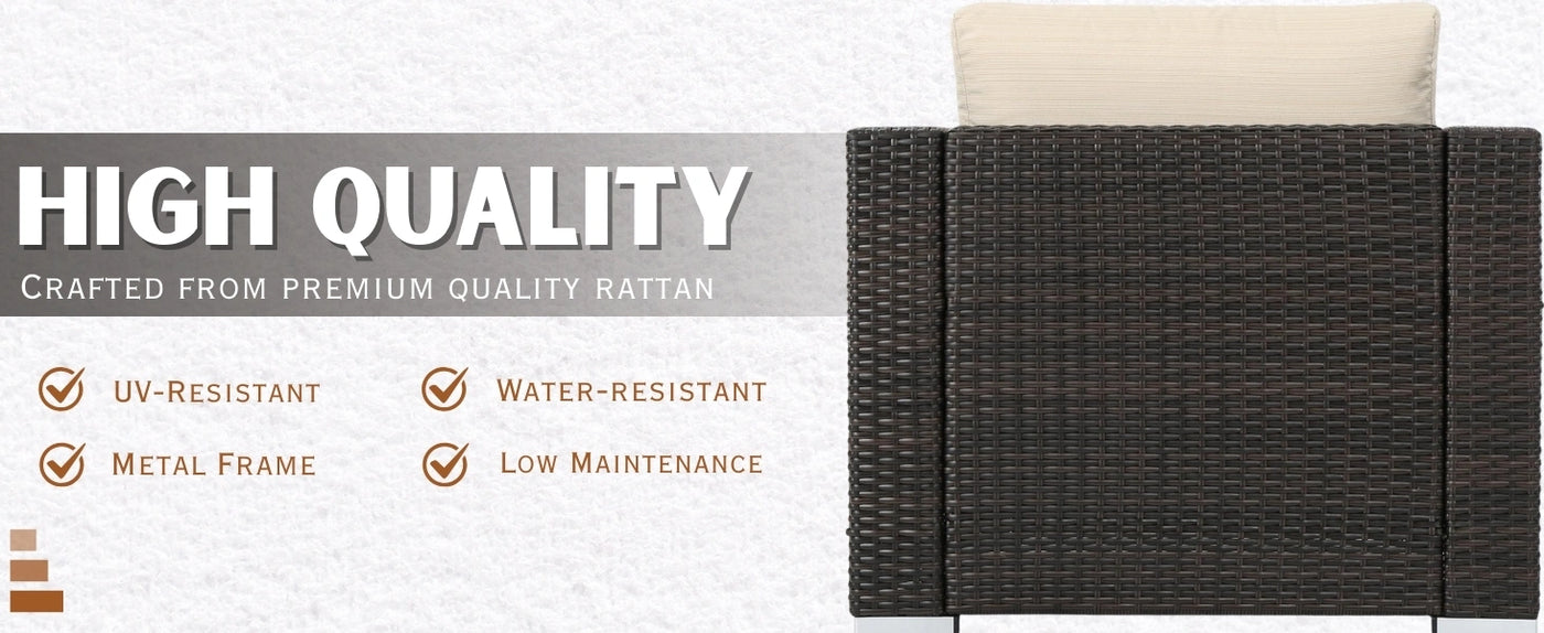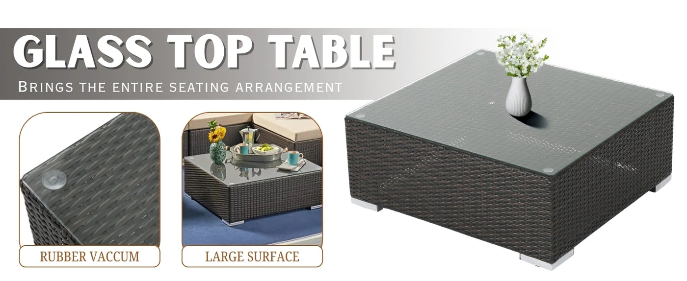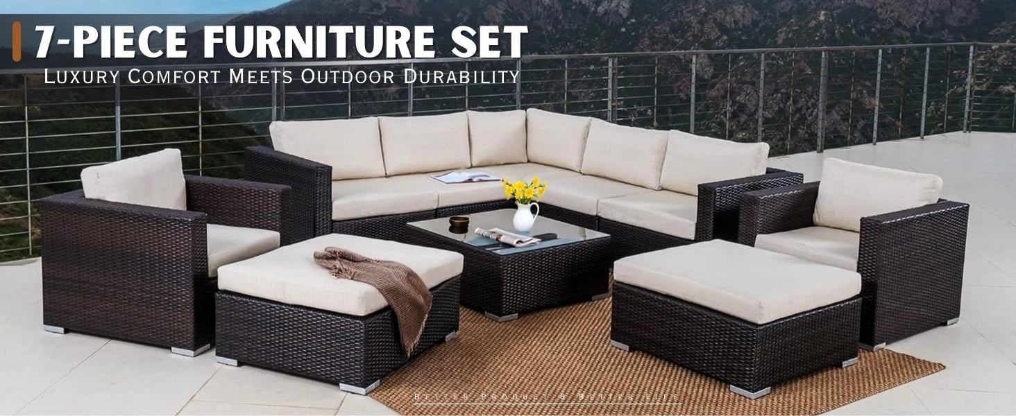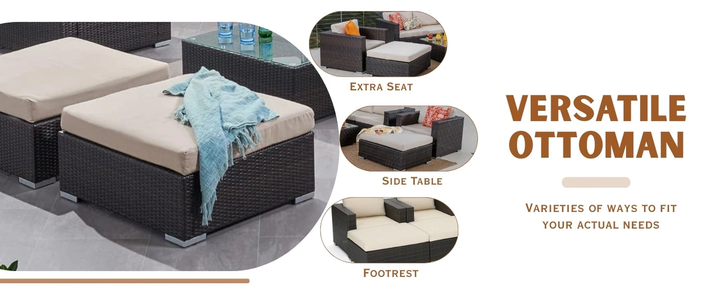 Elevate your outdoor living experience with this beautifully crafted Manual Weaving Wicker Sectional Sofa Set, designed to blend comfort, durability, and timeless style. Whether it's your porch, lawn, garden, or backyard, this premium HDPE rattan furniture set adds a luxurious yet practical touch to your outdoor setting. Handwoven using high-quality, weather-resistant HDPE wicker, the set ensures long-lasting durability through all seasons. The powder-coated metal frame provides a strong foundation that resists rust and corrosion, making it ideal for extended outdoor use. Designed with user comfort in mind, this set includes thick, soft cream-colored cushions with washable covers, ensuring a plush seating experience that’s easy to maintain. The modular design allows you to arrange the pieces to best suit your space and style, offering maximum flexibility for gatherings, lounging, or quiet evening relaxation. The addition of a matching ottoman enhances comfort, providing a spot to stretch out your legs or use as extra seating. The glass-top coffee table serves as the perfect centerpiece—great for placing snacks, drinks, or decorative items while entertaining guests.