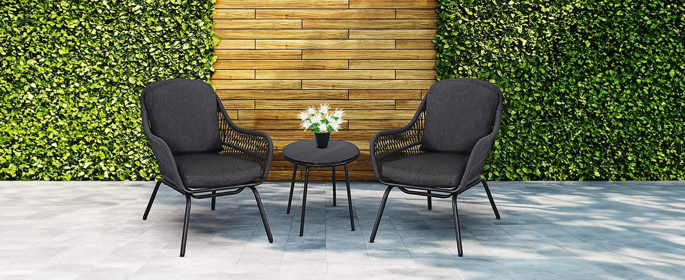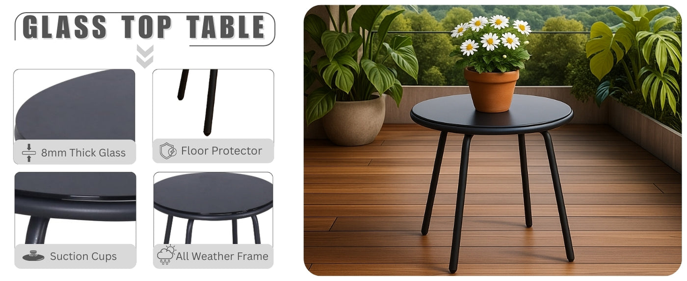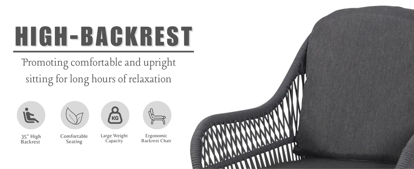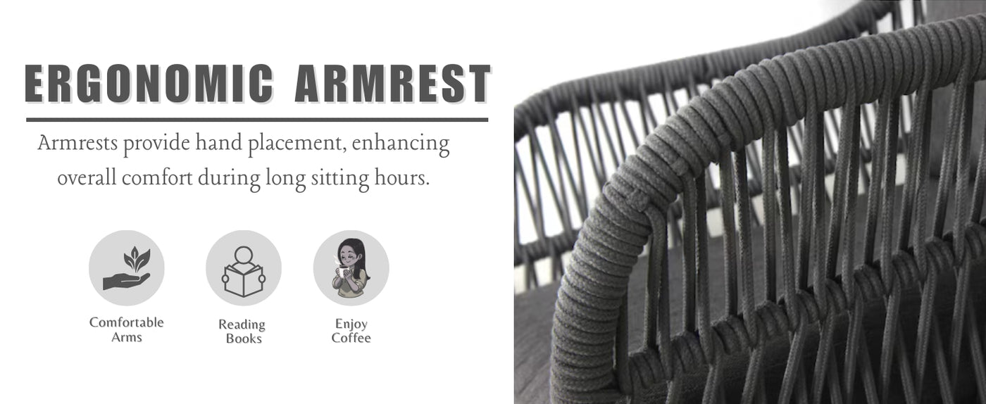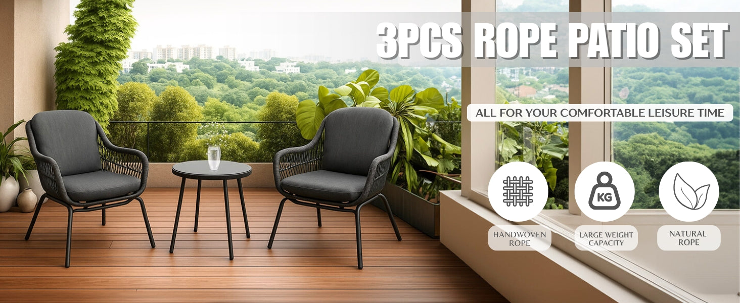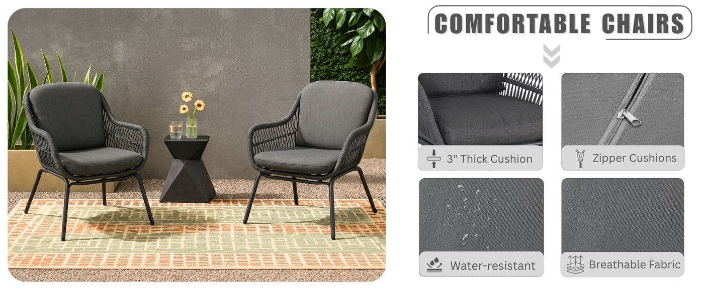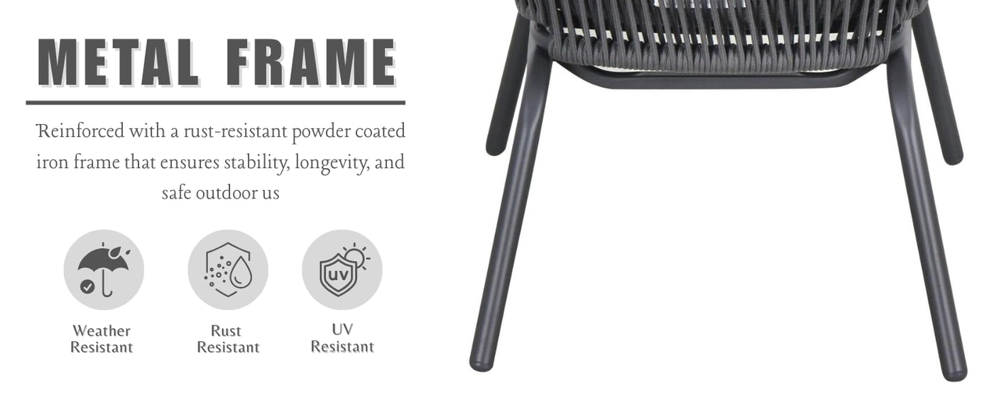 Upgrade your backyard, garden, or balcony with the 3 Piece Outdoor Conversation Set featuring Handwoven Rope Chairs and Waterproof Cushions in Elegant Grey. Designed to combine contemporary style with everyday functionality, this set is your go-to choice for creating a cozy outdoor lounge space. The two beautifully handwoven rope chairs offer a breathable, flexible seat with a unique texture and modern appeal. Paired with thick, waterproof grey cushions, they provide exceptional comfort and support, whether you’re enjoying a morning cup of coffee or an evening chat with friends. The cushions are removable and easy to clean perfect for hassle-free maintenance. Crafted with a powder-coated metal frame, this set is built to last, resisting rust, corrosion, and outdoor wear. The matching tempered glass top side table is compact yet functional, giving you a stable surface for drinks, snacks, or decorative pieces.
