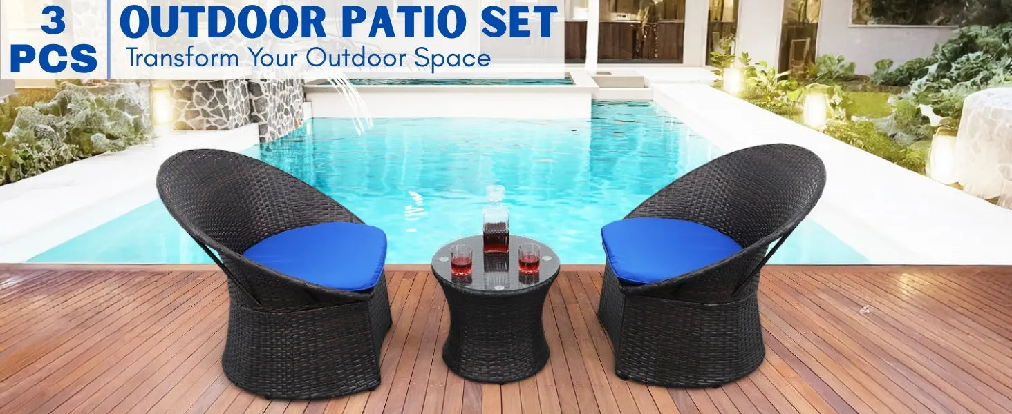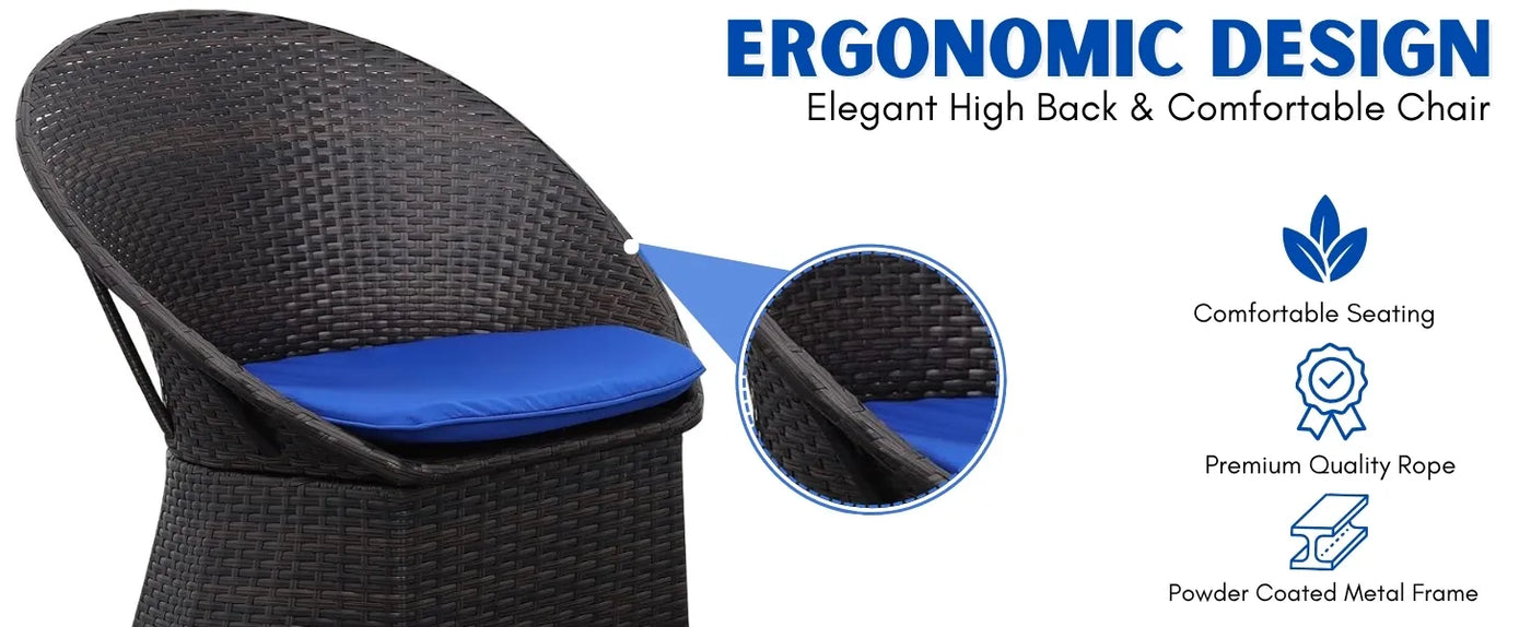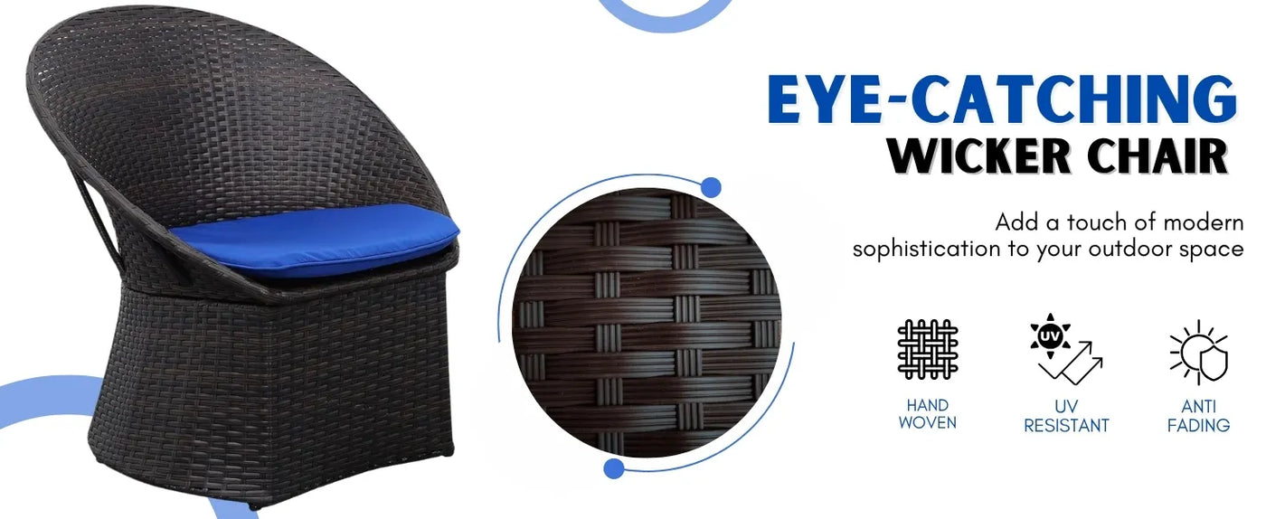 Elevate your outdoor lounging experience with this beautifully designed 3-Piece Outdoor Rattan Wicker Patio Set a perfect blend of elegance, durability, and everyday functionality. Crafted with premium handwoven rattan in a rich dark brown finish, this set adds a sophisticated touch to any garden, lawn, poolside, terrace, or balcony. The vibrant blue cushions add a pop of refreshing color while offering cloud-like comfort, making every moment outdoors more relaxing and enjoyable. This space-saving set includes two ergonomically designed chairs with supportive backrests and a stylish matching coffee table featuring a glass top ideal for serving drinks, snacks, or displaying your favorite décor. The powder-coated metal frame ensures long-lasting stability and rust resistance, while the all-weather wicker construction withstands heat, rain, and humidity making it ideal for year-round outdoor use. Designed for convenience, the soft seat cushions come with removable, washable covers, so maintenance is a breeze. Whether you're sipping morning coffee, catching up with friends, or unwinding under the stars, this versatile set provides the perfect setting for comfort and connection.