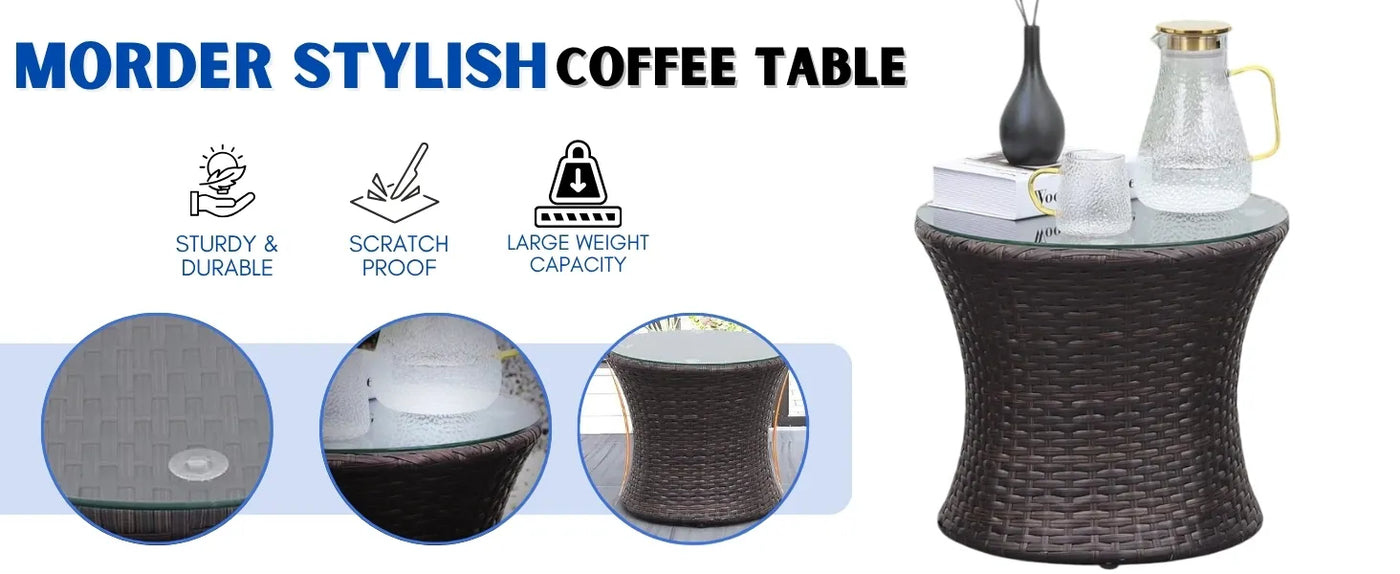 • Stylish Glass-Top Coffee Table : Includes a sleek glass-top table that adds modern charm while providing a sturdy surface for drinks, snacks, or decorative accents.
