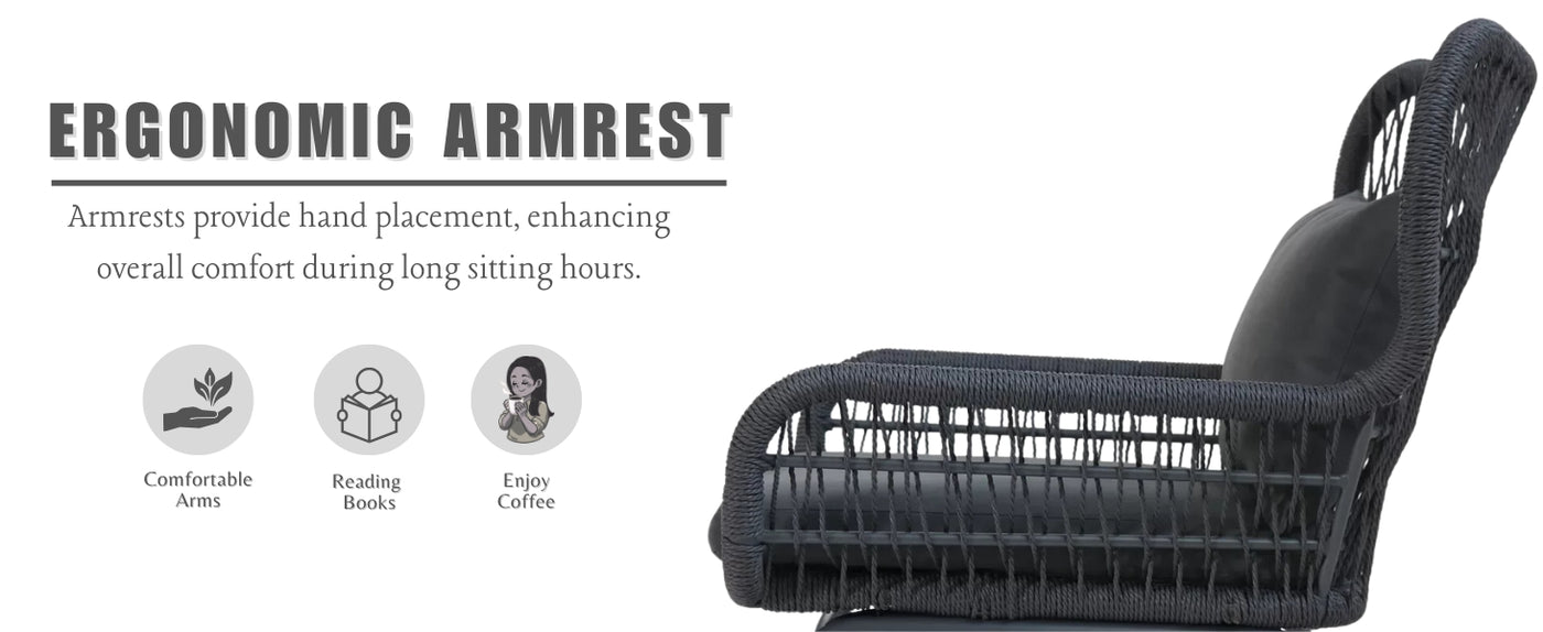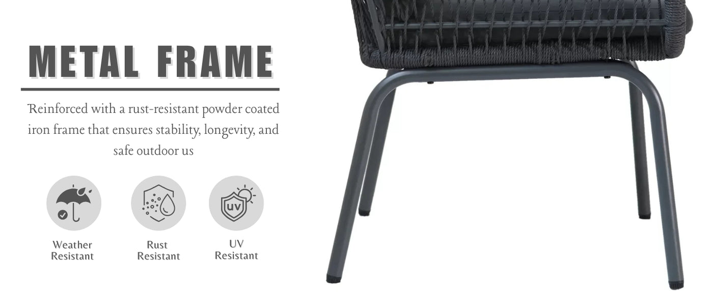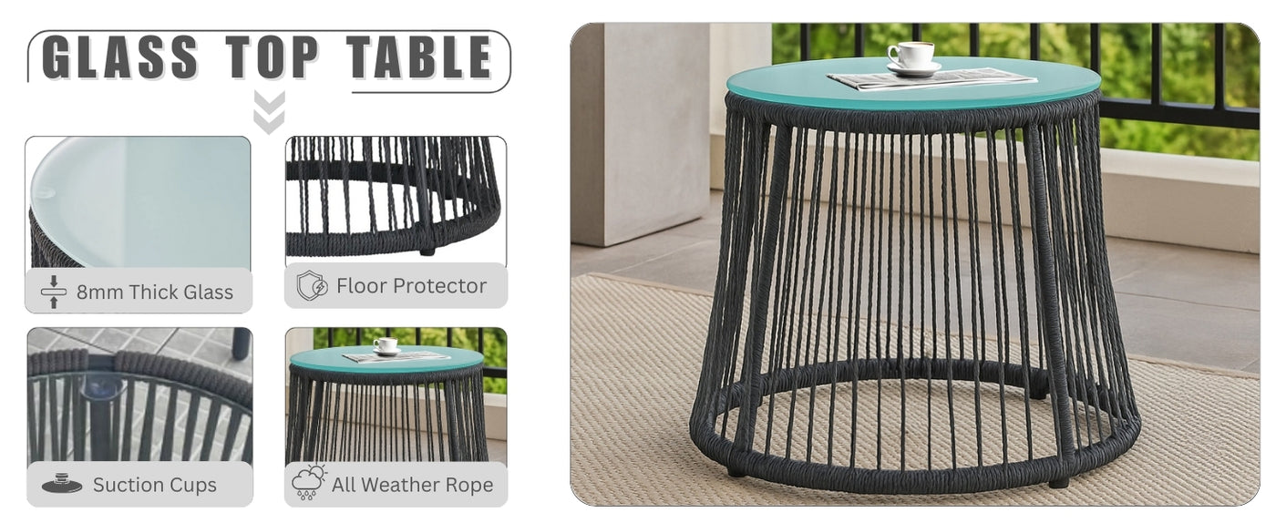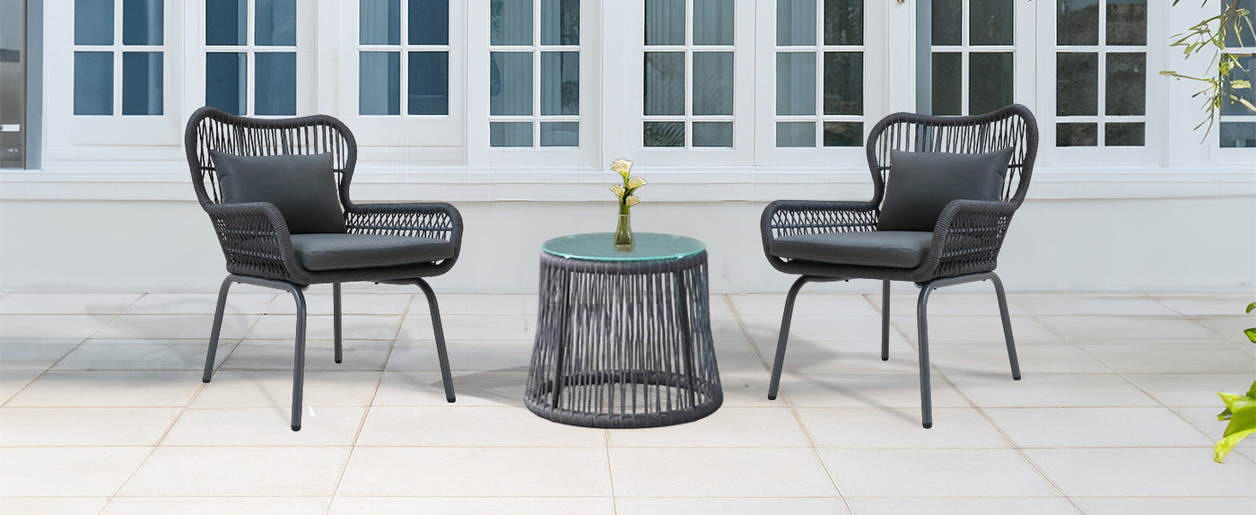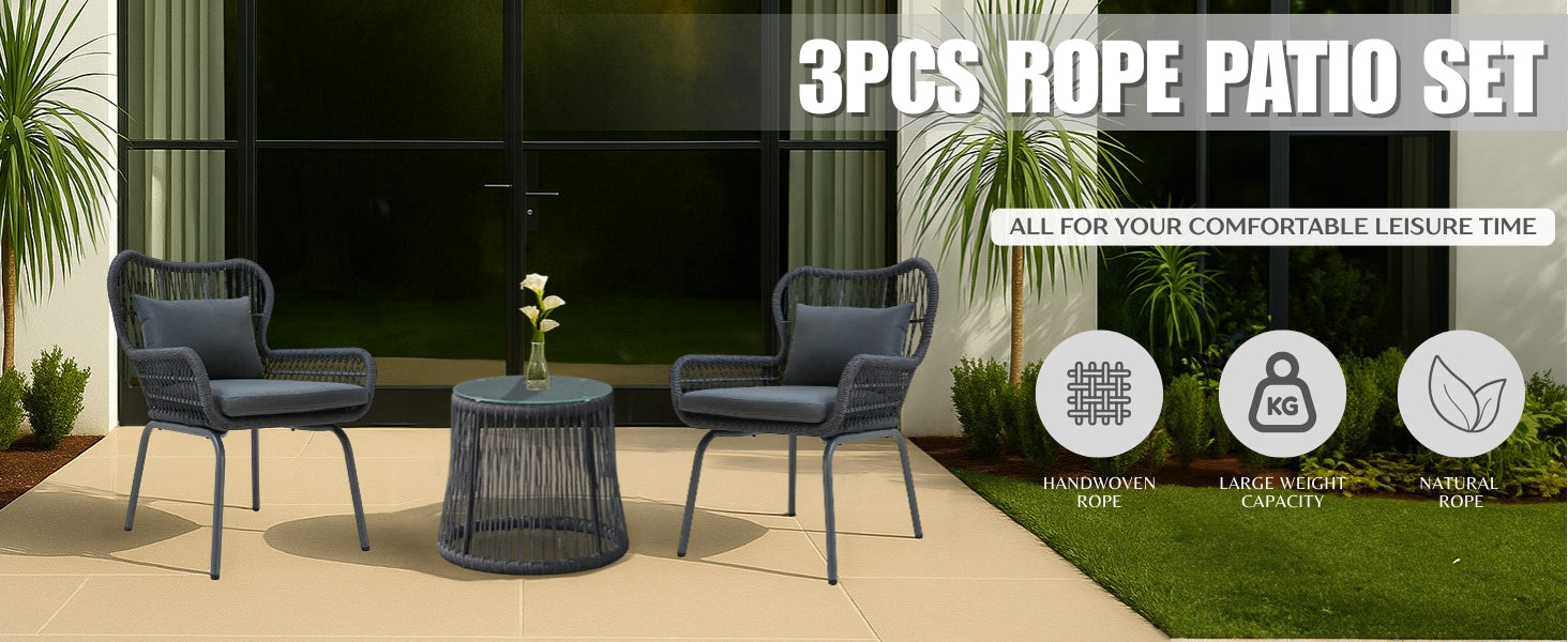 Redefine relaxation with our beautifully designed 3 Piece Patio Rope Furniture Set, perfect for transforming any terrace, garden, balcony, porch, deck, or yard into your personal outdoor retreat. Blending modern elegance with functional comfort, this set is crafted to enhance your lifestyle—one seat at a time. Featuring two handwoven rope chairs in a sophisticated grey palette, this set brings a warm, neutral tone that complements all outdoor settings. The chairs are designed with a breathable rope weave for superior ventilation and paired with plush, water-resistant cushions that offer cozy support for hours of lounging. The included glass-top side table is ideal for resting your coffee, books, or evening drinks—bringing convenience and style together. Whether you're enjoying a quiet morning alone or hosting a sunset chat with friends, this compact set fits beautifully into both small balconies and spacious gardens.