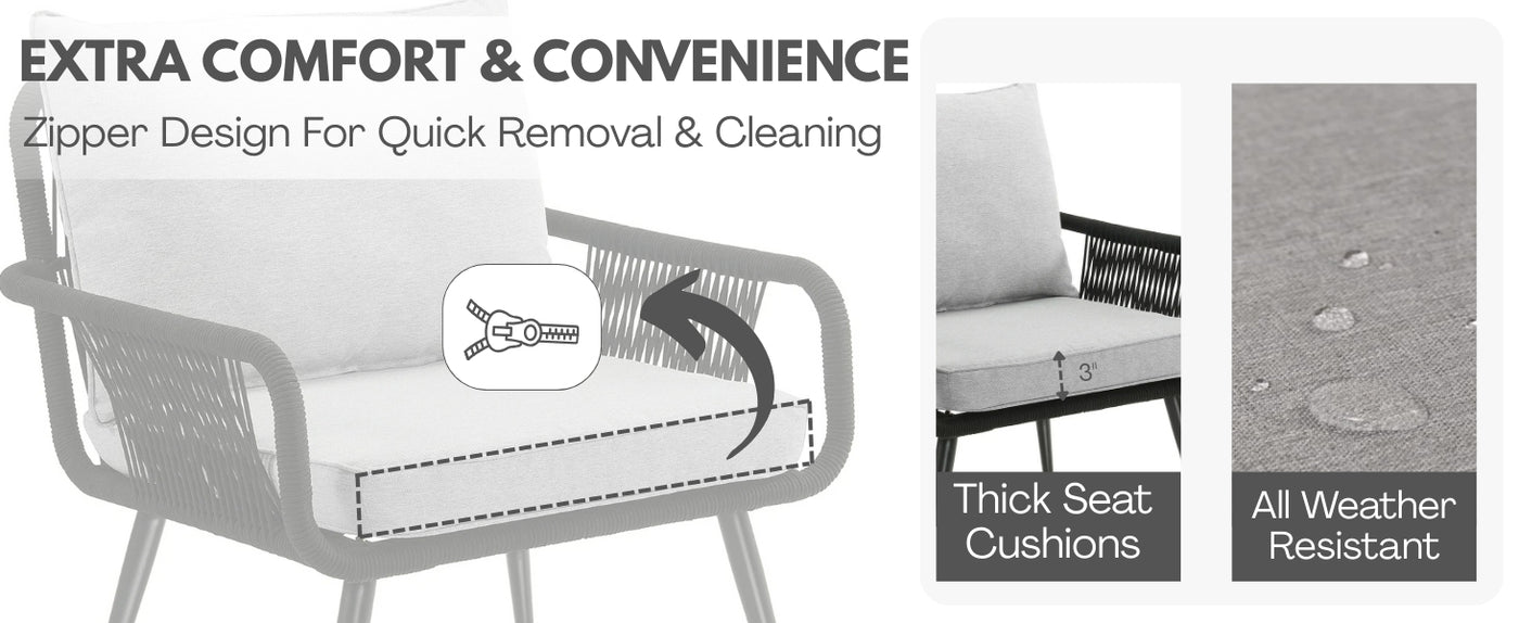 • Easy Maintenance : Removable cushion covers are washable, and the rope material is easy to clean, keeping your outdoor space fresh with minimal effort.