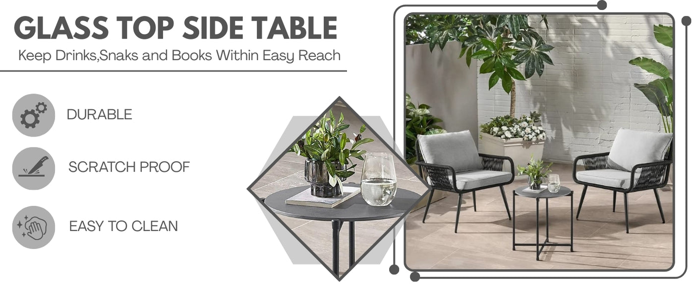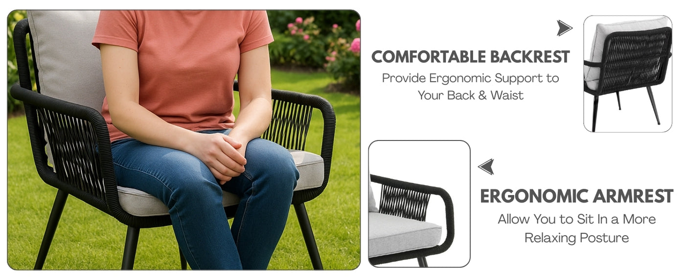 Bring sophistication, comfort, and function to your outdoor living area with our 3-Piece Patio Furniture Set in sleek Black and Grey. Whether you're sipping morning coffee on the balcony, enjoying cocktails with friends on the deck, or unwinding after a long day, this elegant set is designed to complement any outdoor décor while offering exceptional comfort and durability. Crafted with a sturdy powder-coated metal frame, this patio set stands strong against all weather conditions rust-resistant, fade-proof, and built to last through seasons of use. The chairs are wrapped in handwoven all-weather rope or rattan that adds a modern touch while providing breathable support. Soft cushioned seats in weather-resistant grey fabric offer cloud-like comfort and are easy to clean with removable, washable covers. The matching glass-top coffee table provides a stylish, scratch-proof surface for drinks, books, or snacks, making it the perfect centerpiece for any outdoor gathering.