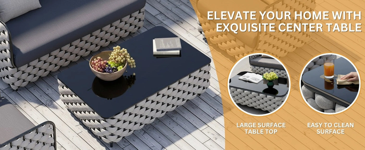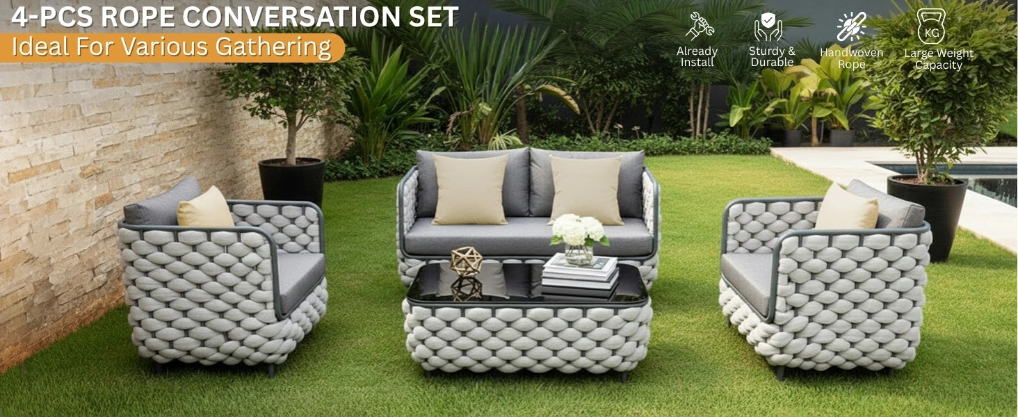 Elevate your outdoor living space with this luxurious 4-piece Outdoor Braid & Rope Sofa Set, designed to blend modern aesthetics with ultimate comfort. Crafted with a hand-braided rope design over a durable powder-coated metal frame, this set offers both style and strength to withstand all weather conditions. The thick cushions ensure plush, supportive seating that feels like sinking into a cloud, making it perfect for long hours of relaxation with friends and family. The set includes a spacious 2-seater sofa, two single chairs, and a glass-top center table, providing a complete solution for patios, gardens, balconies, decks, poolside, or terrace setups. The tabletop adds a sleek touch while offering a sturdy surface for drinks, snacks, or décor items. Built to endure sun, rain, and varying climates, the braided rope and weather-resistant fabric cushions are designed for long-lasting outdoor performance. With its combination of modern craftsmanship, ergonomic design, and premium materials, this sofa set creates a welcoming lounge space that suits both casual gatherings and elegant outdoor entertaining.