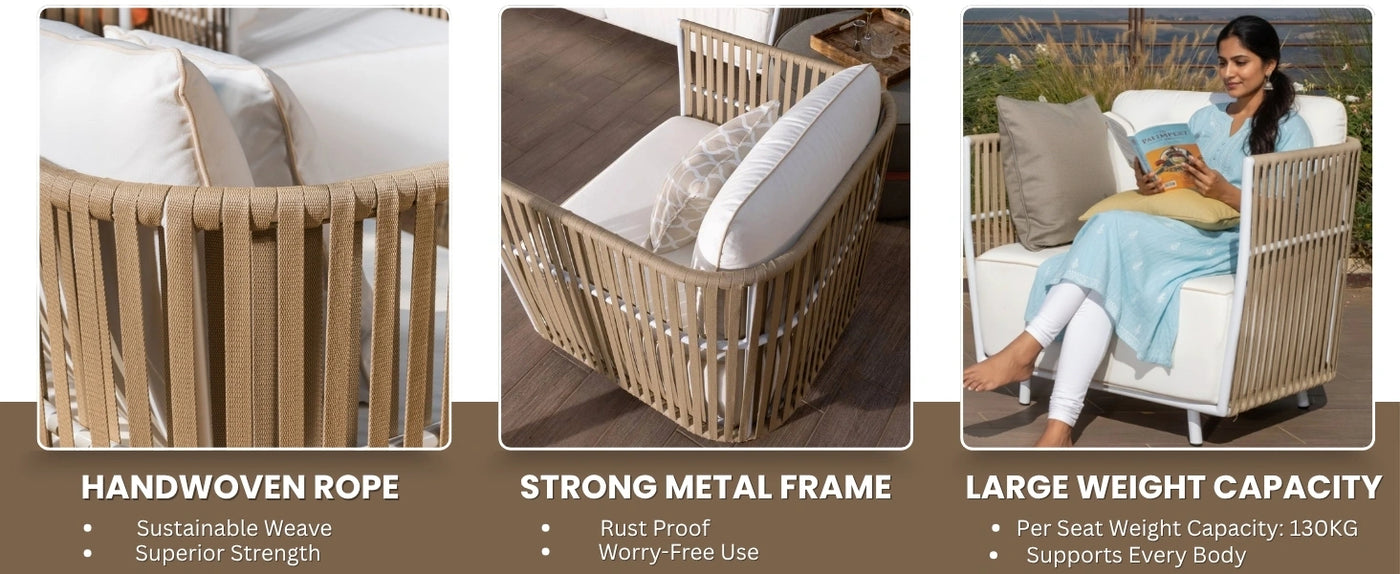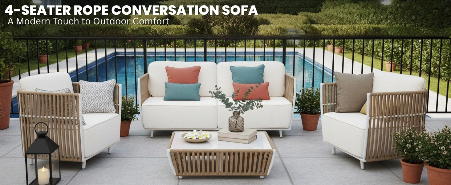 Elevate your outdoor living space with this luxurious 4-piece Outdoor Braid & Rope Sofa Set, designed to blend modern aesthetics with ultimate comfort. Crafted with a hand-braided rope design over a durable powder-coated metal frame, this set offers both style and strength to withstand all weather conditions. The 16-inch ultra-thick cushions ensure plush, supportive seating that feels like sinking into a cloud, making it perfect for long hours of relaxation with friends and family. The set includes a spacious 2-seater sofa, two single chairs, and a glass-top center table, providing a complete solution for patios, gardens, balconies, decks, poolside, or terrace setups. The glass tabletop adds a sleek touch while offering a sturdy surface for drinks, snacks, or décor items. Built to endure sun, rain, and varying climates, the braided rope and weather-resistant fabric cushions are designed for long-lasting outdoor performance. With its combination of modern craftsmanship, ergonomic design, and premium materials, this sofa set creates a welcoming lounge space that suits both casual gatherings and elegant outdoor entertaining.