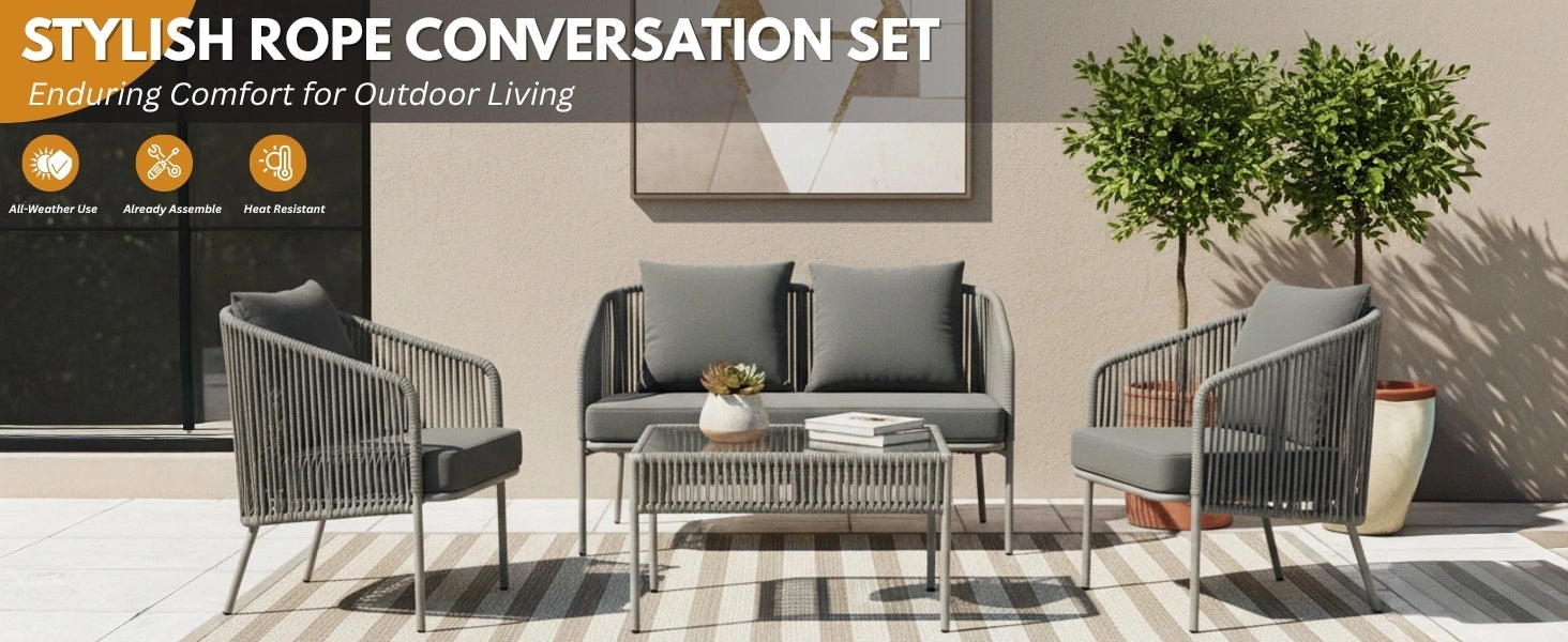 • Weather Resistance : Built to endure sun, rain, and humidity, this set ensures year-round usability. The rope and cushion fabrics are water-resistant, preventing quick absorption of moisture, while the powder-coated frame prevents rusting and corrosion.