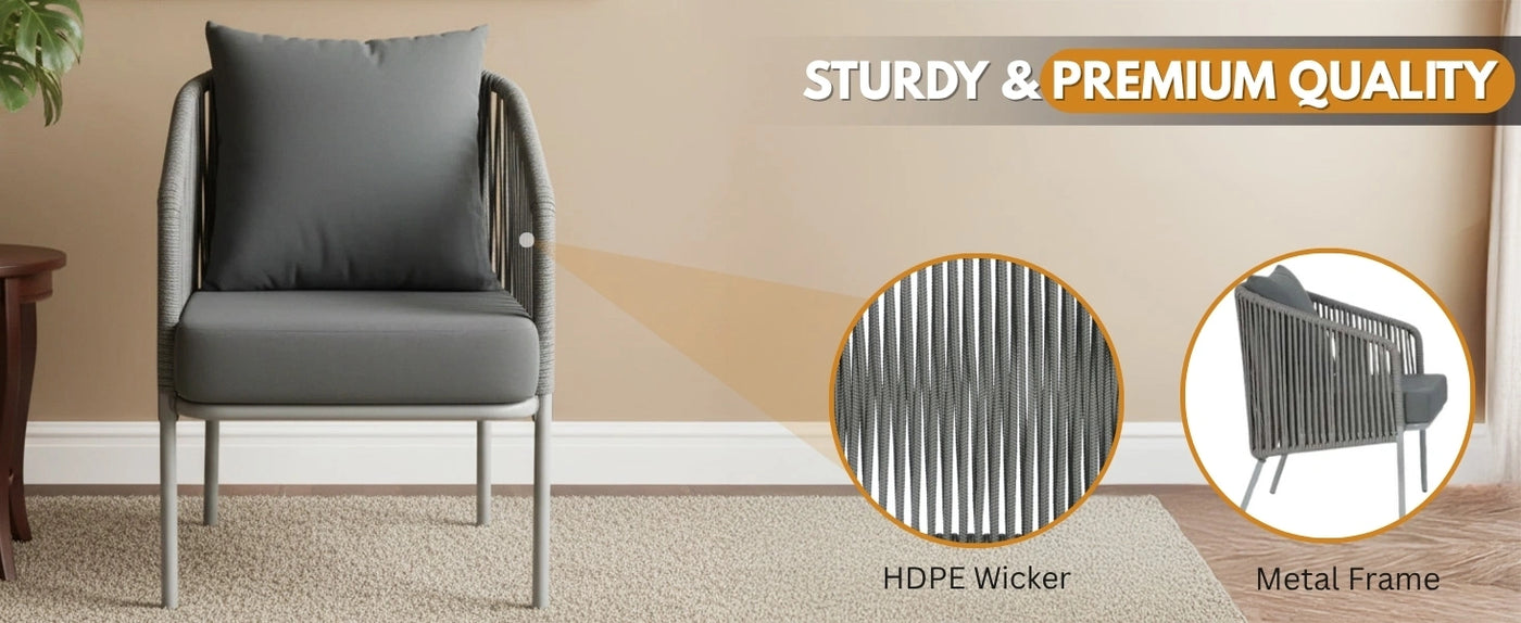 • Durability & Strong Build : The sofa set is crafted with a powder-coated metal frame that offers excellent strength and long-lasting durability. This rust-resistant structure ensures stability while maintaining a lightweight design for easy relocation. The rope weaving is tightly hand-braided, adding resilience against daily wear and tear.