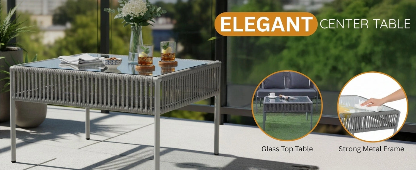 • Premium Material Quality : Made with all-weather weather proof rope and paired with a glass top coffee table, the set combines elegance with functionality. The rope material is UV-resistant, fade-proof, and designed to withstand exposure to outdoor conditions without sagging or losing shape.