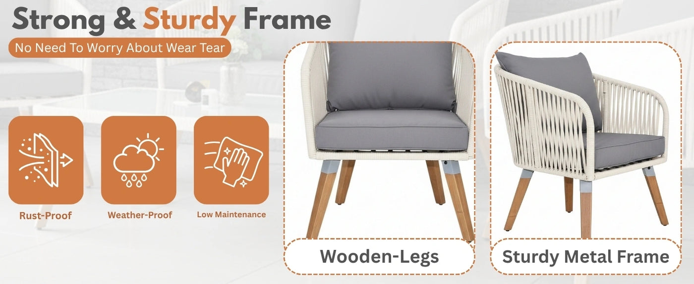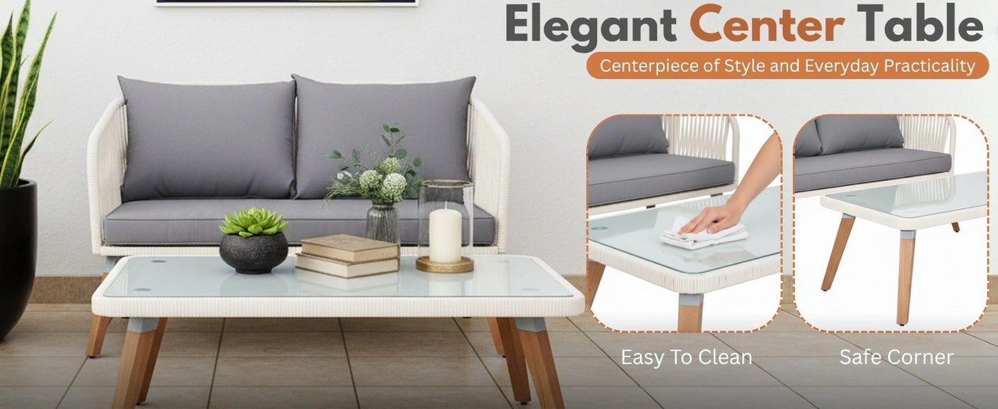 Elevate your outdoor living space with the All-Weather Patio Rope Sofa Set, a perfect blend of durability, elegance, and comfort. Thoughtfully designed with premium handwoven rope and supported by sturdy wooden legs, this set exudes modern sophistication while ensuring long-lasting performance in any season. The glass top coffee table adds a touch of refinement and provides a stable surface for beverages, décor, or outdoor essentials. Built to withstand diverse weather conditions, the set features all-weather rope and a resilient frame that resist fading, moisture, and wear, making it ideal for year-round outdoor use. The ergonomic seating design, complemented by plush, water-resistant cushions, ensures superior comfort for long hours of relaxation or entertaining guests. With its versatile appeal, this rope sofa set seamlessly enhances gardens, lawns, poolside decks, and terrace lounges, bringing a resort-like charm to any setting. Whether used for casual gatherings, family relaxation, or evening conversations, it offers the perfect combination of style and functionality.