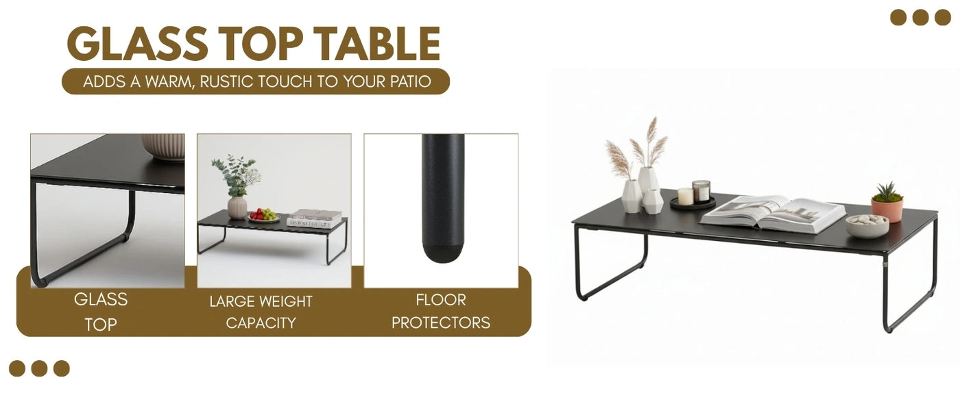 • Glass-Top Coffee Table : Glass top provides a stable, scratch-resistant surface. Easy to clean and ideal for serving drinks, snacks, or displaying decor.
