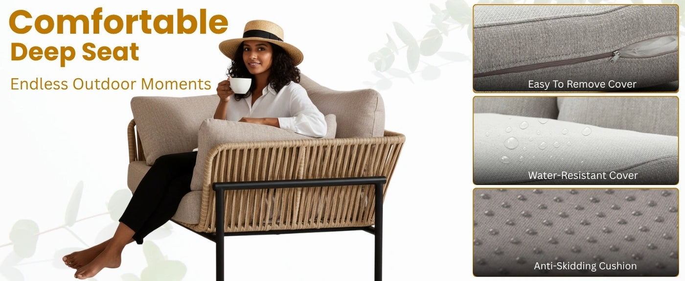 - Plush Cushions with Removable Covers : Thick seat and back cushions for superior comfort. Water-resistant, removable cushion covers for easy cleaning and maintenance.