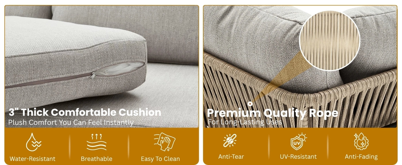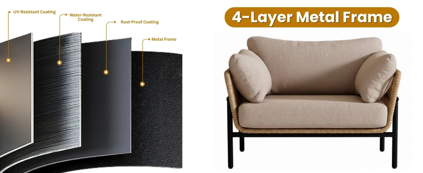 - Materials : Powder-coated metal frame for rust-resistance and strength. Foam-filled with zipper covers that are weather-resistant and breathable. Rope is treated to resist fading, fraying, and mold/mildew from moisture and sun exposure.