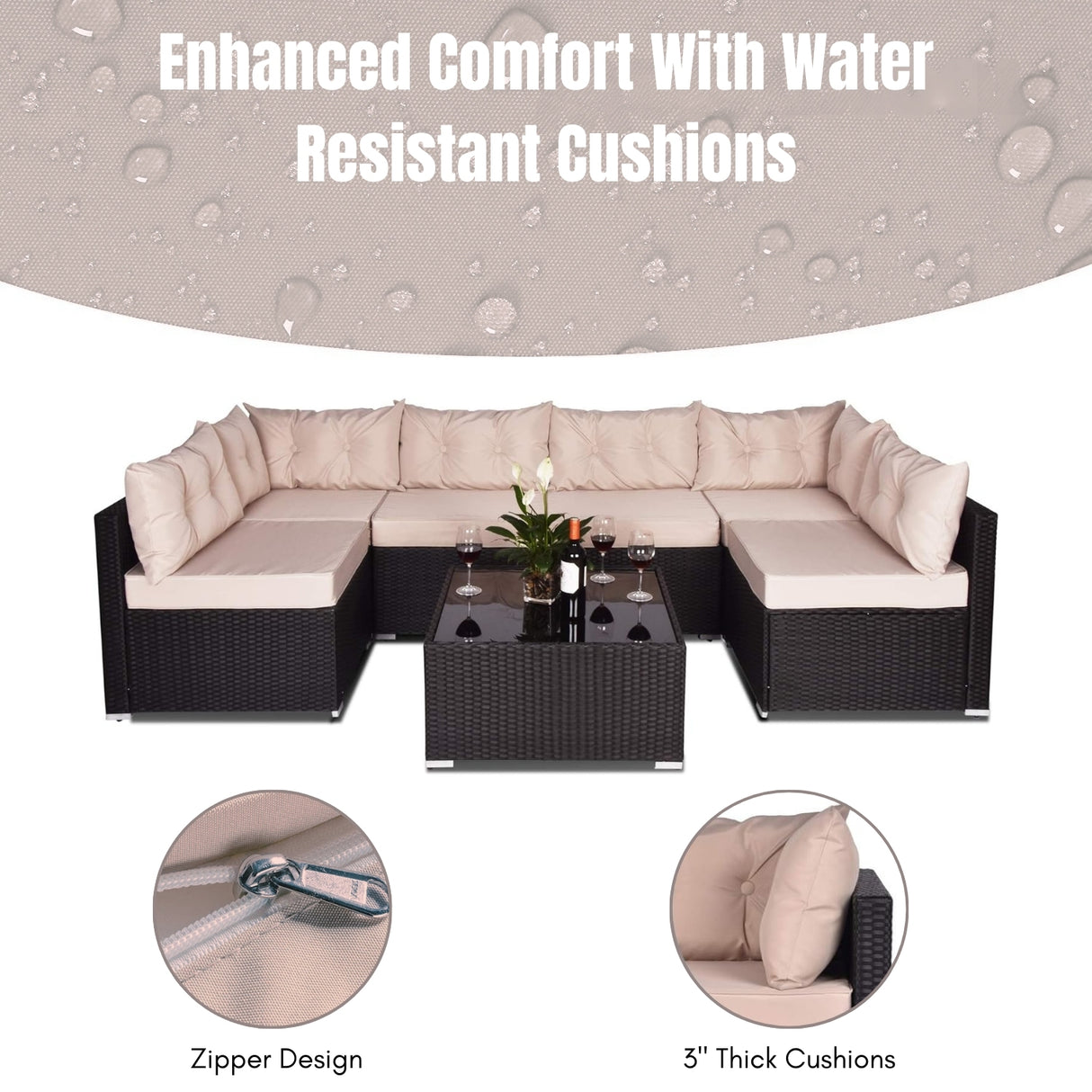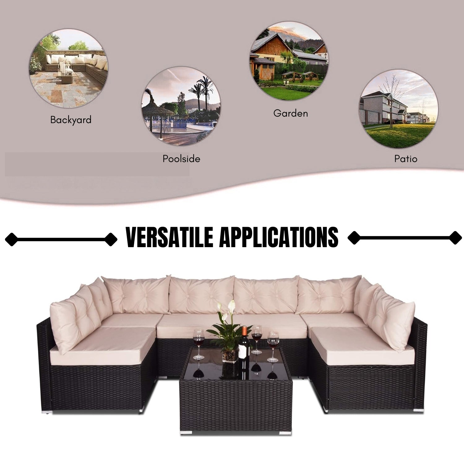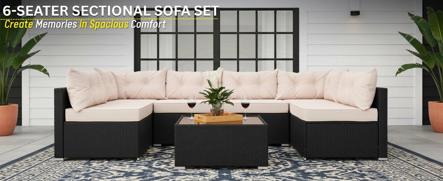 Upgrade your outdoor living space with this beautifully crafted Outdoor Conversation Set, designed to bring luxury, comfort, and functionality to your porch, lawn, garden, or backyard. Handwoven with premium-quality HDPE rattan wicker in a rich dark brown finish, this sectional sofa set combines timeless aesthetics with all-weather durability. The soft cushions add a warm contrast while providing a plush, relaxing experience every time you sit. This modular patio set features a spacious L-shaped sectional sofa and a sturdy glass-top coffee table perfect for everything from cozy family evenings to lively outdoor gatherings. The lightweight yet powder-coated metal frame offers stability without compromising portability, making rearrangement effortless. Plus, the removable cushion covers are washable, ensuring your set stays fresh and inviting season after season. Whether you're enjoying your morning coffee, hosting guests, or simply relaxing under the stars, this conversation set adapts to your lifestyle.