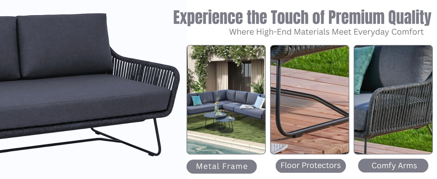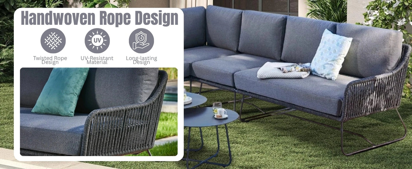 Transform your outdoor living area into a stylish and inviting retreat with this premium L-shape outdoor rope sofa set, thoughtfully designed for use in gardens, decks, lawns, and poolside patios. Blending contemporary aesthetics with durable functionality, this set is crafted to elevate both comfort and outdoor elegance. Expertly handwoven with high-tensile, weather-resistant rope, the sofa offers a refined, airy look while ensuring long-term durability. The frame is constructed from powder-coated metal. This modular L-shaped design maximizes seating space, comfortably accommodating people. The compact yet open layout makes it ideal for corner installations, enhancing both small balconies and expansive patios. Pair it with a matching rope or glass-top coffee table for a complete lounge setup. Whether placed by the pool, on a sunny terrace, or under a pergola, this set is engineered to endure the elements while maintaining its charm. Anti-slip feet protect flooring surfaces, and its lightweight construction allows for effortless repositioning.