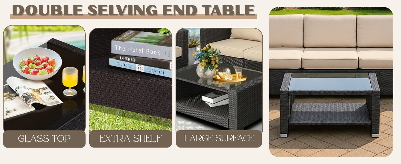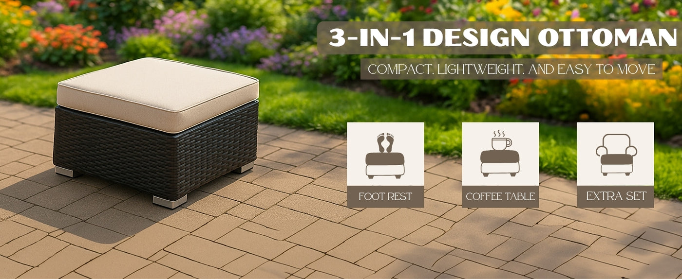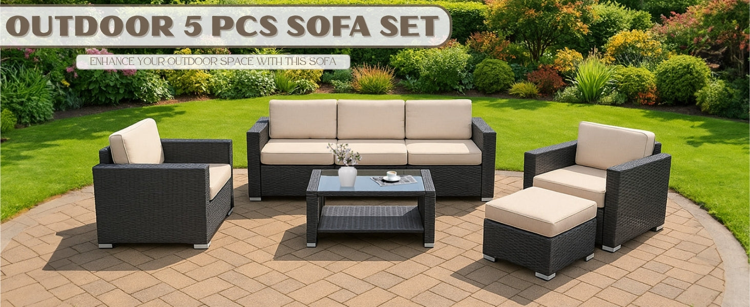 Transform your garden, poolside, or backyard into a luxurious lounge space with this elegant 5-Piece HDPE Wicker Conversation Sofa Set. Designed for style, comfort, and durability, this outdoor furniture set blends dark brown handwoven wicker with soft cream water-resistant cushions, creating a timeless look that elevates any outdoor setting. Crafted with premium HDPE wicker and supported by a powder-coated metal frame, this set stands strong against harsh weather, rust, and daily wear. The included glass top coffee table adds a modern touch while providing a smooth surface for snacks, drinks, or décor. An added ottoman enhances functionality use it as a footrest, extra seat, or side table, offering flexible seating arrangements for small gatherings or cozy evenings. The thick, removable and washable cushions provide lasting comfort and are built to withstand splashes, spills, and sun exposure ideal for year-round outdoor use. Whether you're entertaining guests, sipping your morning coffee, or enjoying family time under the stars, this set promises comfort, style, and practicality in one package.