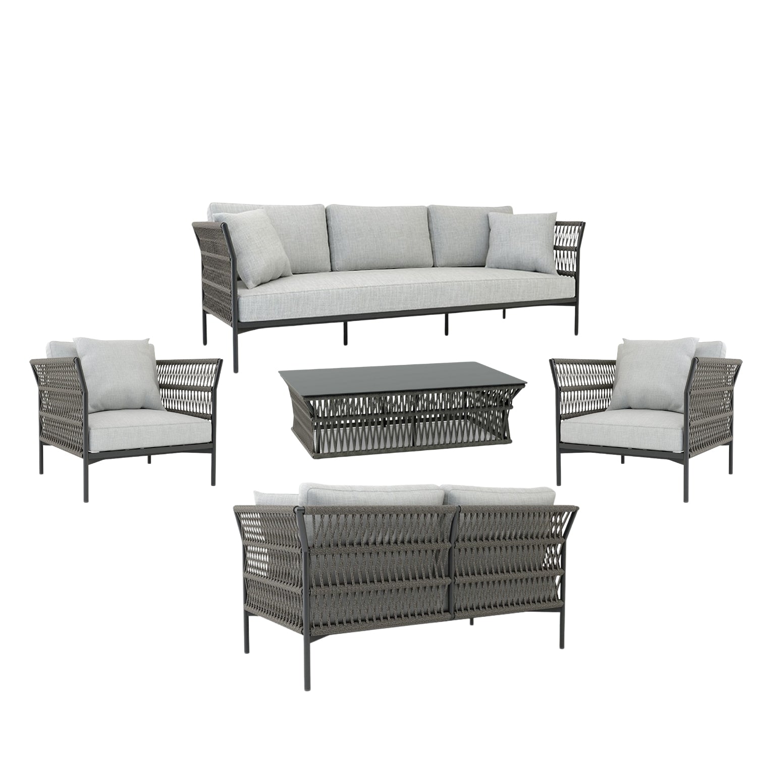 Transform your outdoor living area into a stylish and relaxing retreat with this Outdoor Rope 7-Seater Sofa Set with Glass Top Table. Thoughtfully designed for gardens, decks, lawns, and poolside spaces, this set combines durability, comfort, and modern aesthetics. The set includes a spacious 3-seater sofa, a 2-seater sofa, and two single-seater chairs, accompanied by a sturdy glass-top center table. Each piece is handwoven with all-weather weather proof rope, supported by a rust-resistant powder-coated metal frame that ensures long-lasting strength and stability. Designed for maximum comfort, the sofas and chairs come with thick, soft cushions that are water-resistant and feature removable, washable covers for easy maintenance. The ergonomic backrests and armrests provide excellent support, while the wide seating area allows you and your guests to relax comfortably. The modern rope weave not only adds a luxurious texture but also enhances breathability, keeping the seating cool even in warm weather. With its timeless design and versatile layout, this set easily adapts to different outdoor décors, making it an ideal choice for family gatherings, lounging, or entertaining guests by the pool.