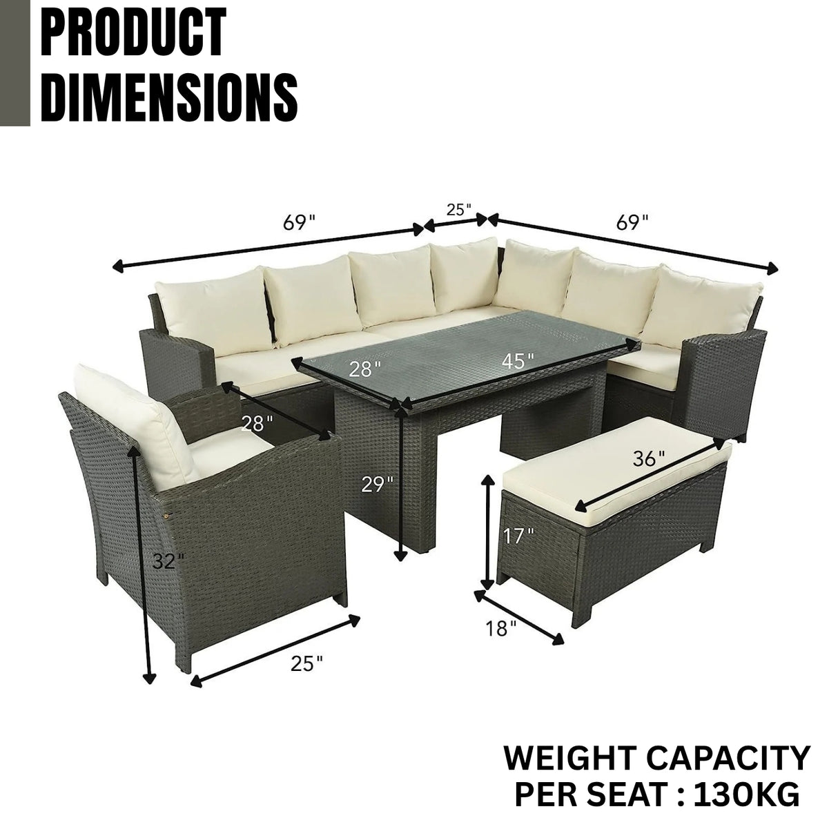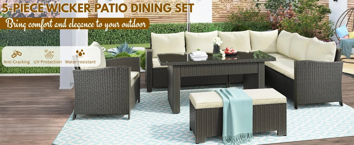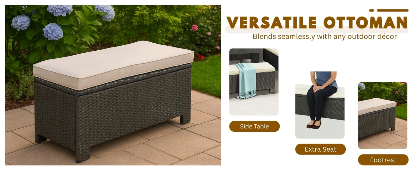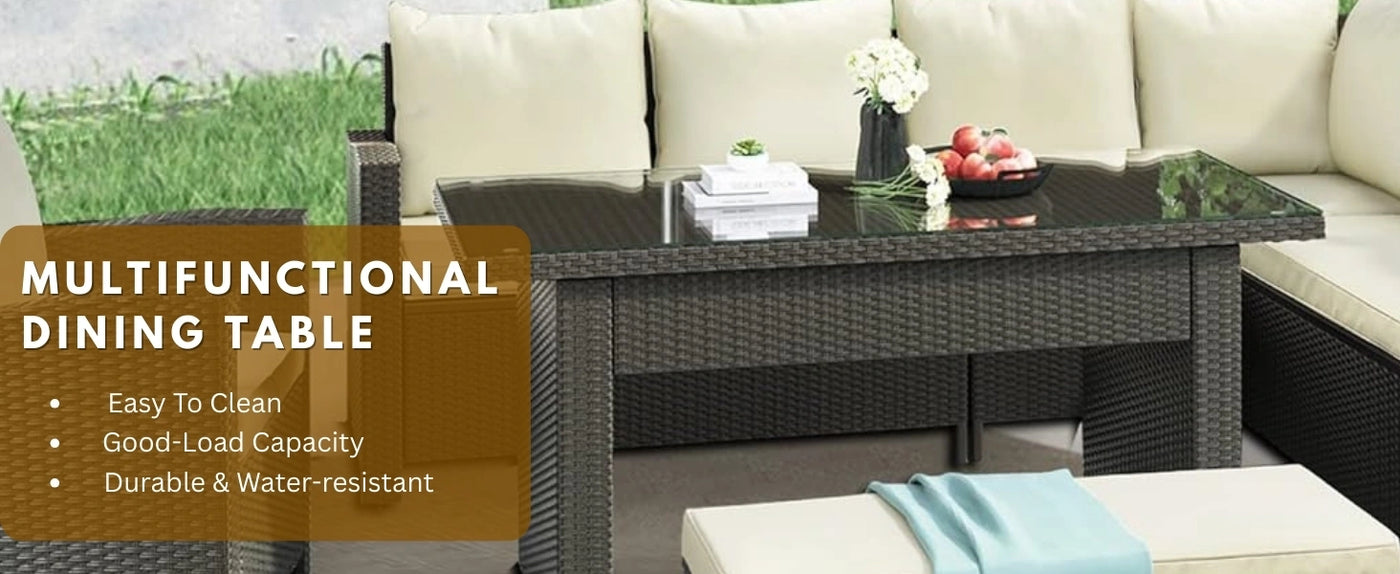 Elevate your outdoor living experience with this beautifully crafted Manual Weaving Wicker Sectional Sofa Set, designed to blend comfort, durability, and timeless style. Whether it's your porch, lawn, garden, or backyard, this premium HDPE rattan furniture set adds a luxurious yet practical touch to your outdoor setting. Handwoven using high-quality, weather-resistant HDPE wicker, the set ensures long-lasting durability through all seasons. The powder-coated metal frame provides a strong foundation that resists rust and corrosion, making it ideal for extended outdoor use. Designed with user comfort in mind, this set includes thick, soft cushions with washable covers, ensuring a plush seating experience that’s easy to maintain. The modular design allows you to arrange the pieces to best suit your space and style, offering maximum flexibility for gatherings, lounging, or quiet evening relaxation. The addition of a matching ottoman enhances comfort, providing a spot to stretch out your legs or use as extra seating. The glass-top coffee table serves as the perfect centerpiece great for placing snacks, drinks, or decorative items while entertaining guests.