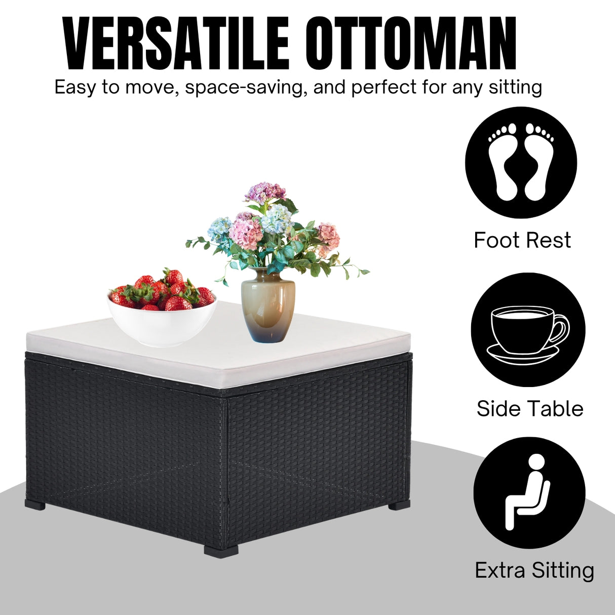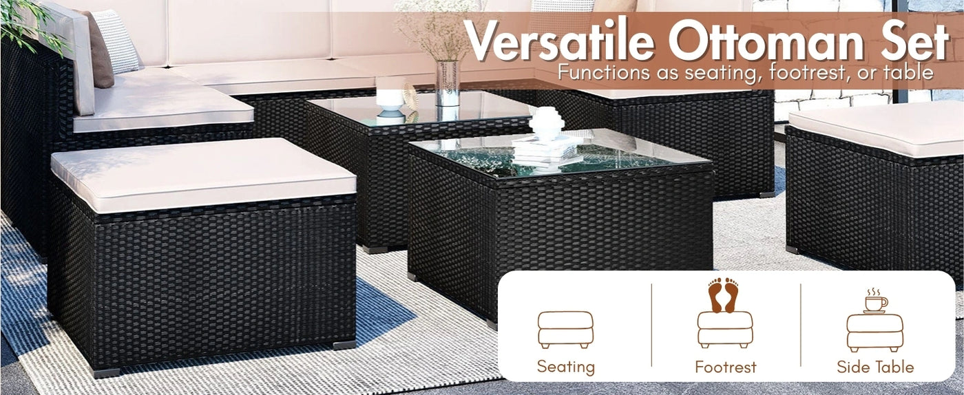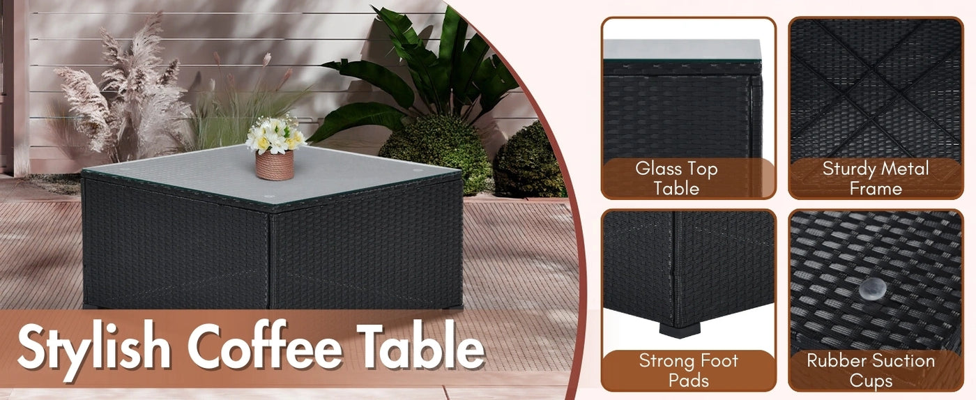 Elevate your outdoor living experience with this beautifully crafted Manual Weaving Wicker Sectional Sofa Set, designed to blend comfort, durability, and timeless style. Whether it's your porch, lawn, garden, or backyard, this premium HDPE rattan furniture set adds a luxurious yet practical touch to your outdoor setting. Handwoven using high-quality, weather-resistant HDPE wicker, the set ensures long-lasting durability through all seasons. The powder-coated metal frame provides a strong foundation that resists rust and corrosion, making it ideal for extended outdoor use. Designed with user comfort in mind, this set includes thick, soft cushions with washable covers, ensuring a plush seating experience that’s easy to maintain. The modular design allows you to arrange the pieces to best suit your space and style, offering maximum flexibility for gatherings, lounging, or quiet evening relaxation. The addition of a matching ottoman enhances comfort, providing a spot to stretch out your legs or use as extra seating. The glass-top coffee table serves as the perfect centerpiece great for placing snacks, drinks, or decorative items while entertaining guests.