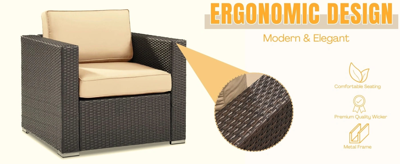 Elevate your outdoor living experience with this beautifully crafted Manual Weaving Wicker Sectional Sofa Set, designed to blend comfort, durability, and timeless style. Whether it's your porch, lawn, garden, or backyard, this premium HDPE rattan furniture set adds a luxurious yet practical touch to your outdoor setting. Handwoven using high-quality, weather-resistant HDPE wicker, the set ensures long-lasting durability through all seasons. The powder-coated metal frame provides a strong foundation that resists rust and corrosion, making it ideal for extended outdoor use. Designed with user comfort in mind, this set includes thick, soft cream-colored cushions with washable covers, ensuring a plush seating experience that’s easy to maintain. The modular design allows you to arrange the pieces to best suit your space and style, offering maximum flexibility for gatherings, lounging, or quiet evening relaxation. The addition of a matching ottoman enhances comfort, providing a spot to stretch out your legs or use as extra seating. The glass-top coffee table serves as the perfect centerpiece—great for placing snacks, drinks, or decorative items while entertaining guests.