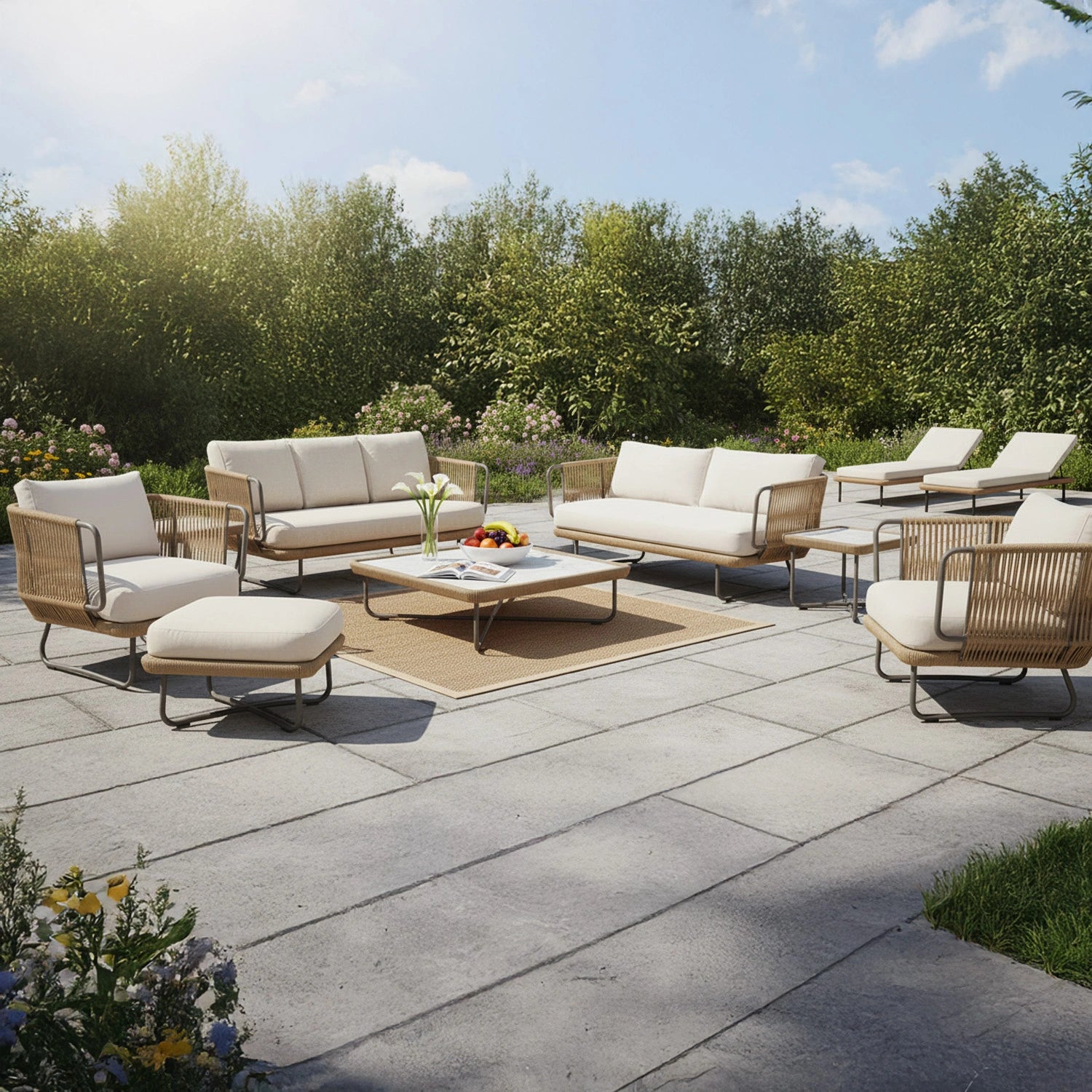 10 Seater Outdoor Rope Sofa Set with Ottoman, Loungers, Center Table & Side Tables