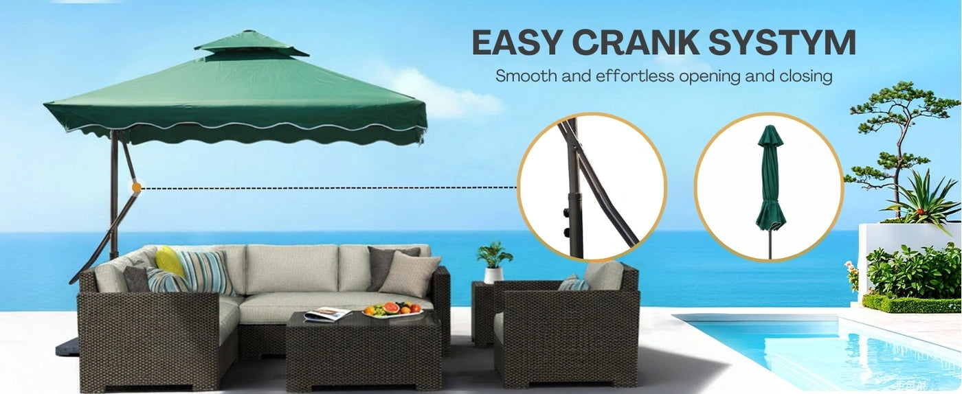 - Sturdy Side Pole Design for Unobstructed Space : Innovative off-set side pole structure offers a clutter-free shaded area with no central obstruction ideal for placing furniture directly underneath.