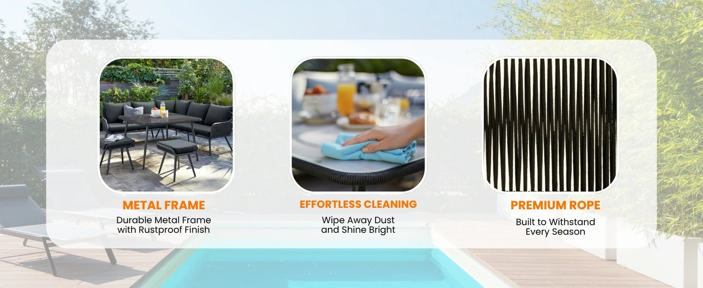 1. Rope Furniture - Clean with mild soap and water, avoid excess moisture, and cover when not in use to prevent wear from sun and rain.