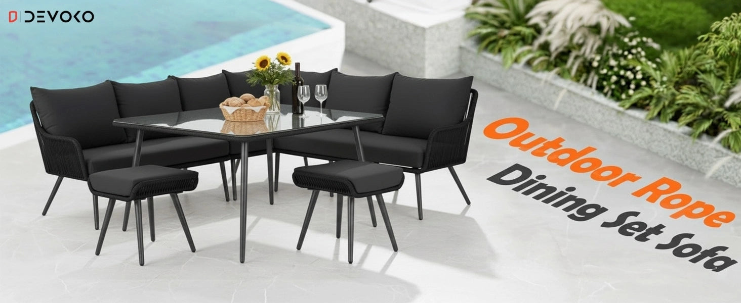 Transform your outdoor living area into a stylish and inviting retreat with this premium L-shape outdoor rope sofa set, thoughtfully designed for use in gardens, decks, lawns, and poolside patios. Blending contemporary aesthetics with durable functionality, this set is crafted to elevate both comfort and outdoor elegance. Expertly handwoven with high-tensile, weather-resistant rope, the sofa offers a refined, airy look while ensuring long-term durability. The frame is constructed from powder-coated metal. This modular L-shaped design maximizes seating space, comfortably accommodating people. The compact yet open layout makes it ideal for corner installations, enhancing both small balconies and expansive patios. Pair it with a matching rope or glass-top coffee table for a complete lounge setup. Whether placed by the pool, on a sunny terrace, or under a pergola, this set is engineered to endure the elements while maintaining its charm. Anti-slip feet protect flooring surfaces, and its lightweight construction allows for effortless repositioning.