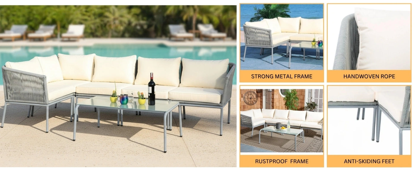 Transform your outdoor living area into a stylish and inviting retreat with this premium L-shape outdoor rope sofa set, thoughtfully designed for use in gardens, decks, lawns, and poolside patios. Blending contemporary aesthetics with durable functionality, this set is crafted to elevate both comfort and outdoor elegance. Expertly handwoven with high-tensile, weather-resistant rope, the sofa offers a refined, airy look while ensuring long-term durability. The frame is constructed from powder-coated metal. This modular L-shaped design maximizes seating space, comfortably accommodating people. The compact yet open layout makes it ideal for corner installations, enhancing both small balconies and expansive patios. Pair it with a matching rope or glass-top coffee table for a complete lounge setup. Whether placed by the pool, on a sunny terrace, or under a pergola, this set is engineered to endure the elements while maintaining its charm. Anti-slip feet protect flooring surfaces, and its lightweight construction allows for effortless repositioning.