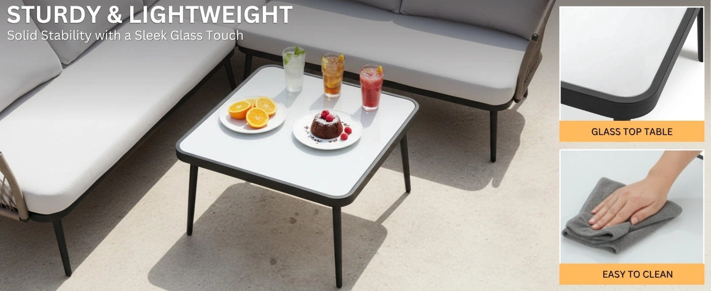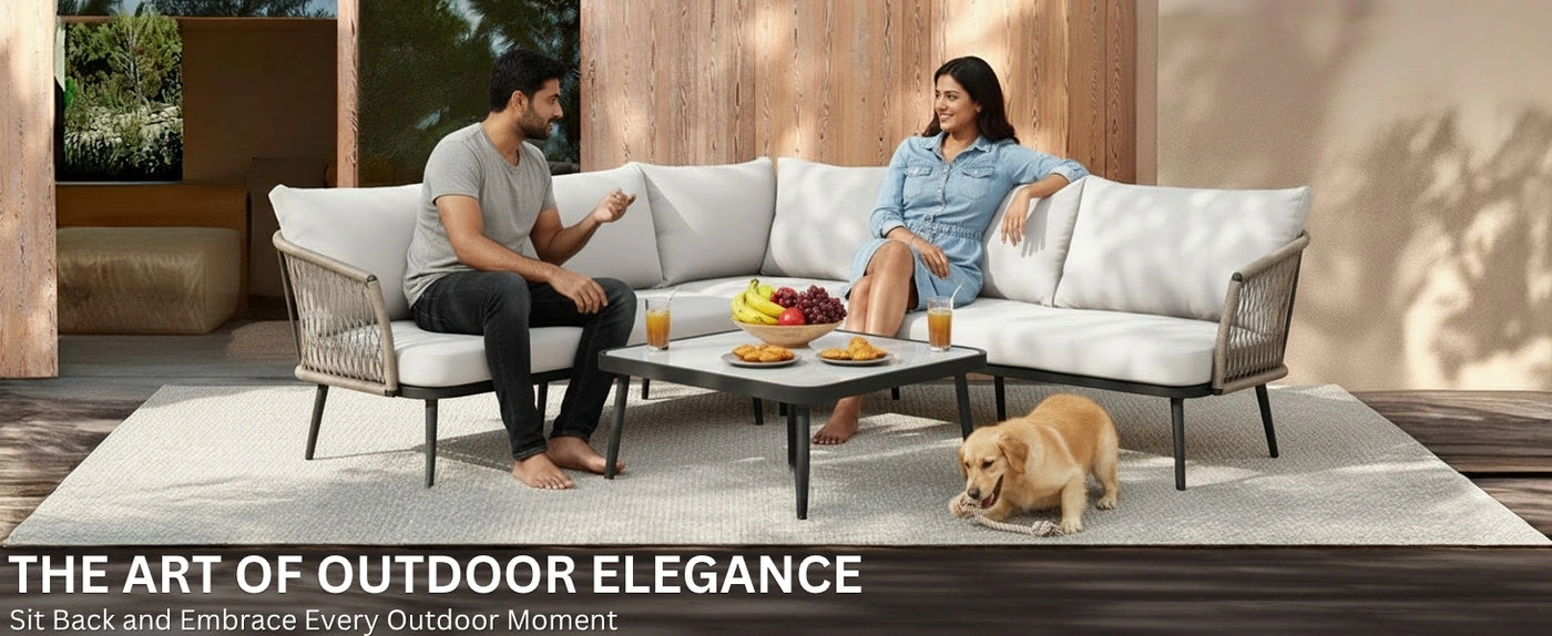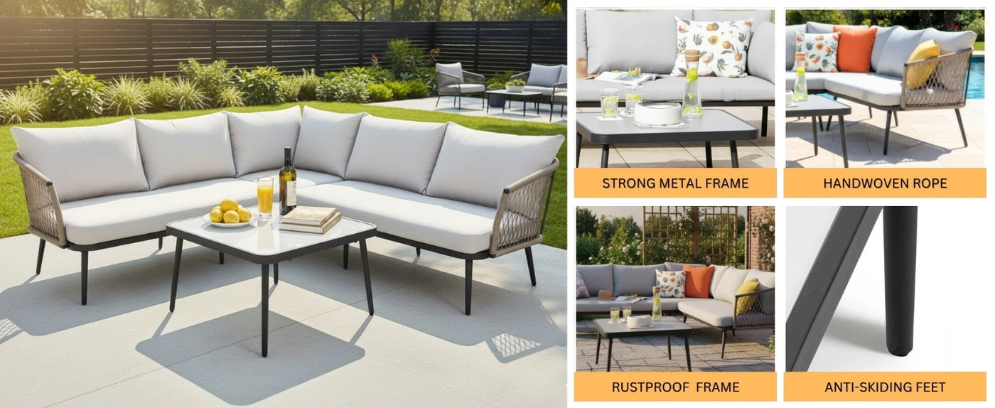 Transform your outdoor living area into a stylish and inviting retreat with this premium L-shape outdoor rope sofa set, thoughtfully designed for use in gardens, decks, lawns, and poolside patios. Blending contemporary aesthetics with durable functionality, this set is crafted to elevate both comfort and outdoor elegance. Expertly handwoven with high-tensile, weather-resistant rope, the sofa offers a refined, airy look while ensuring long-term durability. The frame is constructed from powder-coated metal. This modular L-shaped design maximizes seating space, comfortably accommodating people. The compact yet open layout makes it ideal for corner installations, enhancing both small balconies and expansive patios. Pair it with a matching rope or glass-top coffee table for a complete lounge setup. Whether placed by the pool, on a sunny terrace, or under a pergola, this set is engineered to endure the elements while maintaining its charm. Anti-slip feet protect flooring surfaces, and its lightweight construction allows for effortless repositioning.