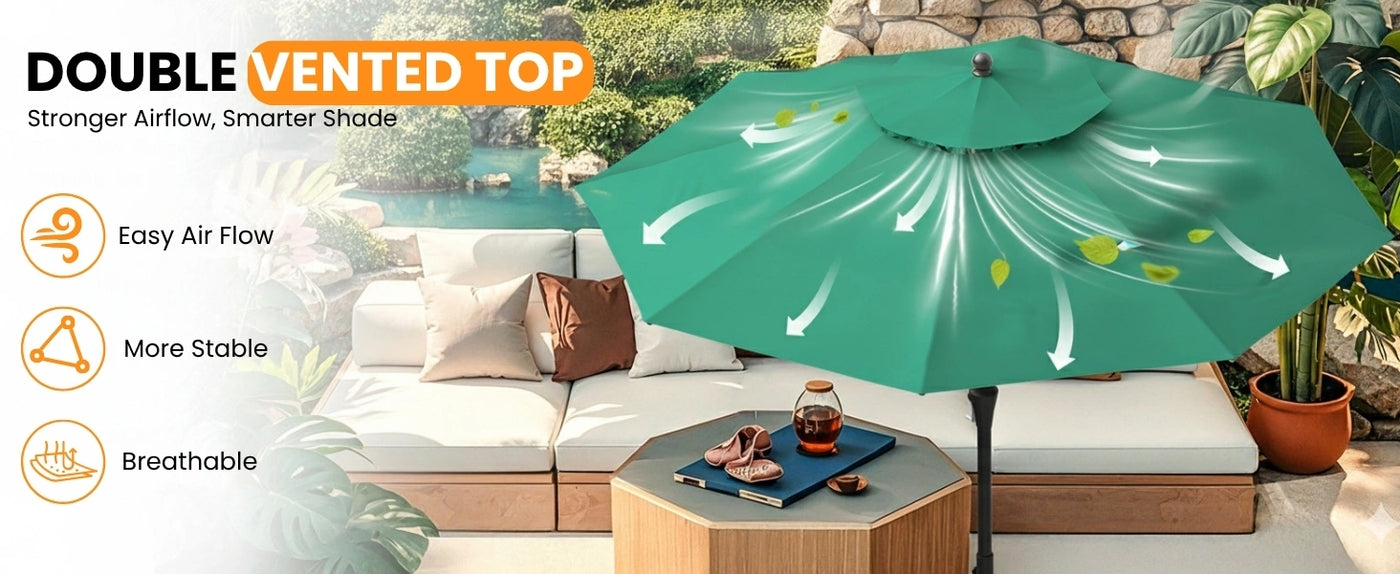 - Ventilated Top for Airflow and Wind Resistance : Built-in vent at the top promotes airflow and heat dissipation, helping the umbrella stay cooler and more stable during breezy conditions.