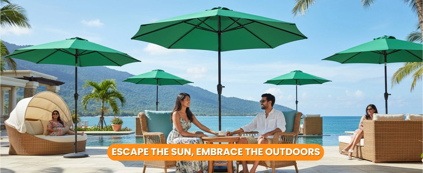Bring elegance and comfort to your outdoor spaces with this 9ft Green Outdoor Patio Umbrella, designed to transform your garden, beach outing, café patio, or balcony into a cool, shaded retreat. With its generous canopy and UV-resistant fabric, this umbrella provides reliable protection from the sun while adding a touch of refined style to any setting. Crafted for durability and convenience, the umbrella features a strong central pole and a user-friendly crank mechanism that allows you to open and close it effortlessly. The wide 9-foot diameter creates ample shade ideal for covering patio tables, lounge areas, or café seating arrangements keeping you and your guests cool even on the sunniest days. Made with high-quality, fade-resistant polyester fabric, the umbrella blocks harmful UV rays, helping protect your skin and preserving the umbrella’s elegant beige tone. The sturdy metal frame and ribs ensure wind resistance and long-term use, while the neutral color blends seamlessly into any outdoor décor.