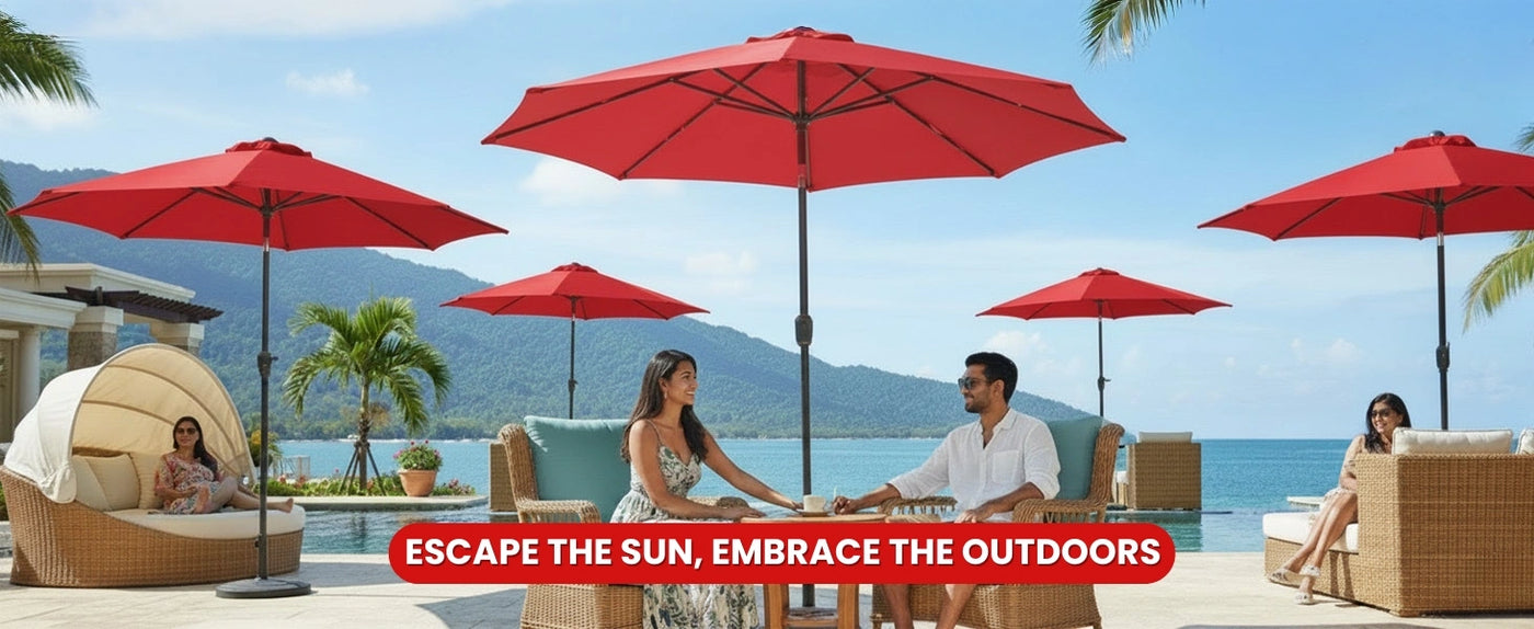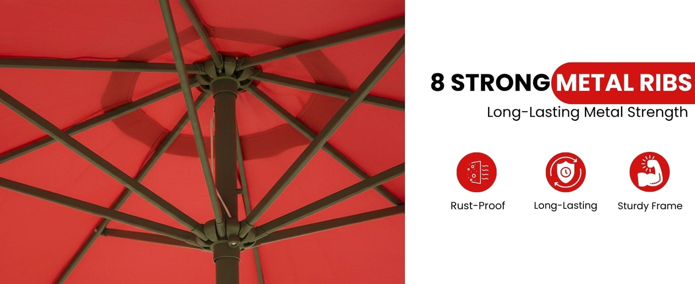 Bring elegance and comfort to your outdoor spaces with this 9ft Red Outdoor Patio Umbrella, designed to transform your garden, beach outing, café patio, or balcony into a cool, shaded retreat. With its generous canopy and UV-resistant fabric, this umbrella provides reliable protection from the sun while adding a touch of refined style to any setting. Crafted for durability and convenience, the umbrella features a strong central pole and a user-friendly crank mechanism that allows you to open and close it effortlessly. The wide 9-foot diameter creates ample shade ideal for covering patio tables, lounge areas, or café seating arrangements keeping you and your guests cool even on the sunniest days. Made with high-quality, fade-resistant polyester fabric, the umbrella blocks harmful UV rays, helping protect your skin and preserving the umbrella’s elegant beige tone. The sturdy metal frame and ribs ensure wind resistance and long-term use, while the neutral color blends seamlessly into any outdoor décor.