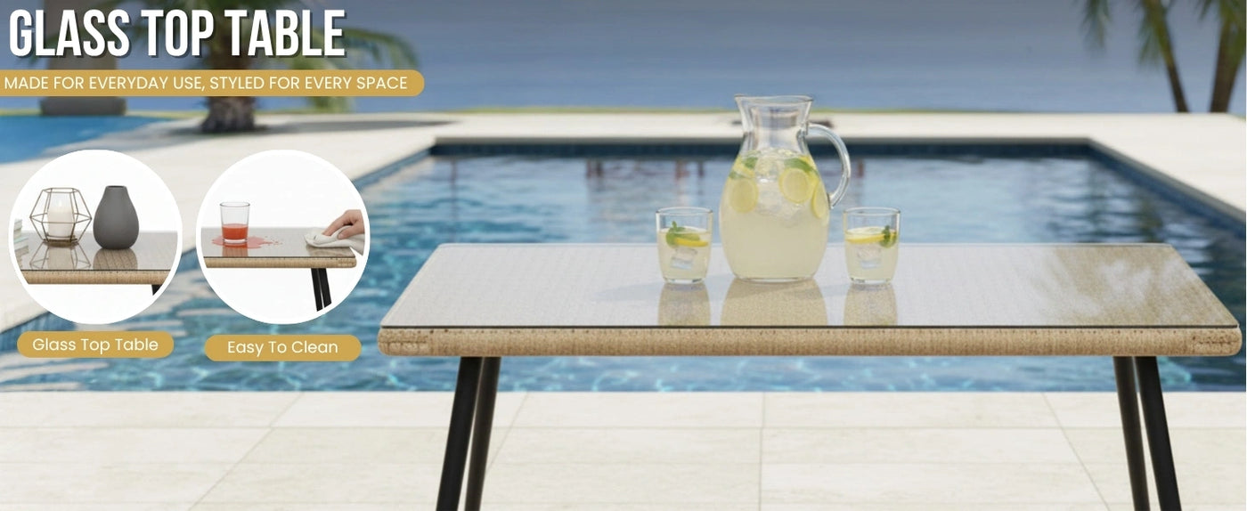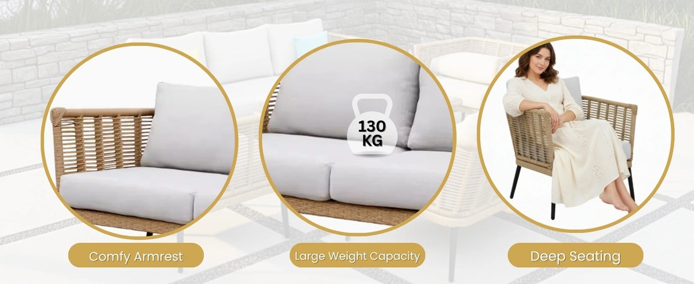 Transform your outdoor living area into a stylish and relaxing retreat with this Outdoor Rope 7-Seater Sofa Set with Glass Top Table. Thoughtfully designed for gardens, decks, lawns, and poolside spaces, this set combines durability, comfort, and modern aesthetics. The set includes a spacious 3-seater sofa, a 2-seater sofa, and two single-seater chairs, accompanied by a sturdy glass-top center table. Each piece is handwoven with all-weather waterproof rope, supported by a rust-resistant powder-coated metal frame that ensures long-lasting strength and stability. Designed for maximum comfort, the sofas and chairs come with thick, soft cushions that are water-resistant and feature removable, washable covers for easy maintenance. The ergonomic backrests and armrests provide excellent support, while the wide seating area allows you and your guests to relax comfortably. The modern rope weave not only adds a luxurious texture but also enhances breathability, keeping the seating cool even in warm weather. With its timeless design and versatile layout, this set easily adapts to different outdoor décors, making it an ideal choice for family gatherings, lounging, or entertaining guests by the pool.