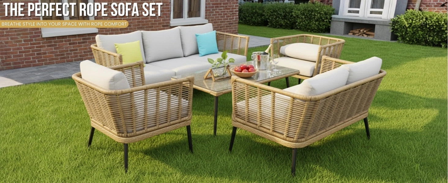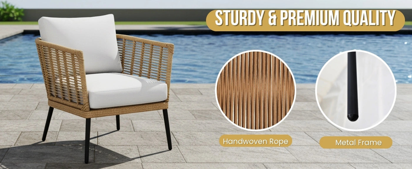 1. Rope Furniture - Clean with mild soap and water, avoid excess moisture, and cover when not in use to prevent wear from sun and rain.