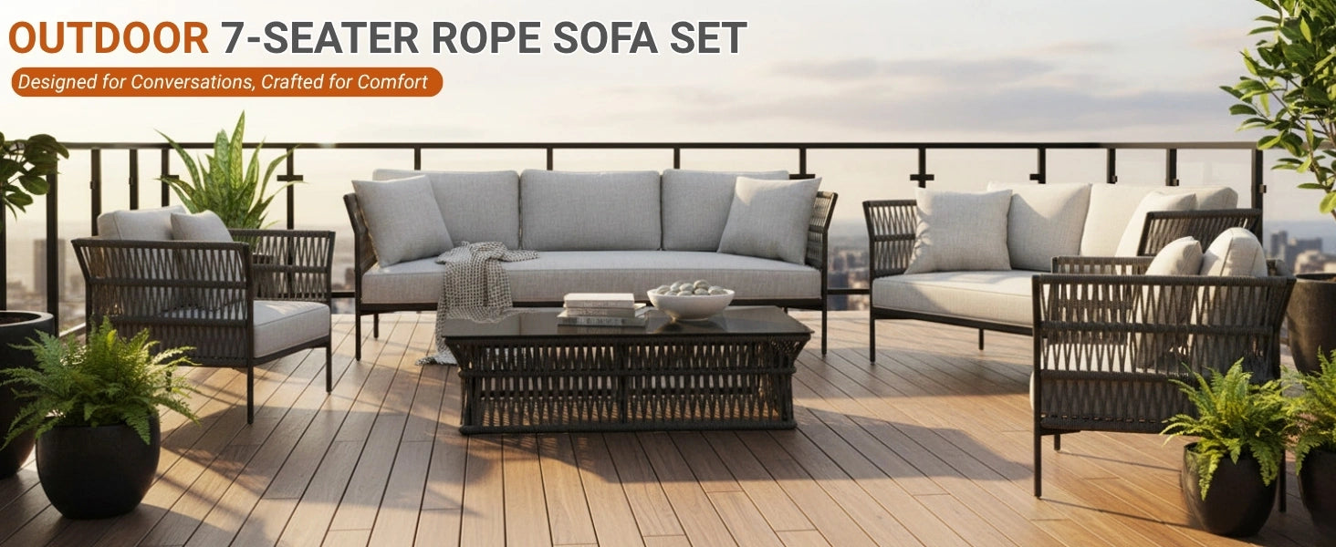 Outdoor Rope 7-Seater Sofa Set With Glass Top Table