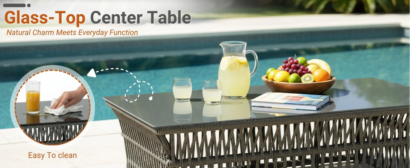 Transform your outdoor living area into a stylish and relaxing retreat with this Outdoor Rope 7-Seater Sofa Set with Glass Top Table. Thoughtfully designed for gardens, decks, lawns, and poolside spaces, this set combines durability, comfort, and modern aesthetics. The set includes a spacious 3-seater sofa, a 2-seater sofa, and two single-seater chairs, accompanied by a sturdy glass-top center table. Each piece is handwoven with all-weather weather proof rope, supported by a rust-resistant powder-coated metal frame that ensures long-lasting strength and stability. Designed for maximum comfort, the sofas and chairs come with thick, soft cushions that are water-resistant and feature removable, washable covers for easy maintenance. The ergonomic backrests and armrests provide excellent support, while the wide seating area allows you and your guests to relax comfortably. The modern rope weave not only adds a luxurious texture but also enhances breathability, keeping the seating cool even in warm weather. With its timeless design and versatile layout, this set easily adapts to different outdoor décors, making it an ideal choice for family gatherings, lounging, or entertaining guests by the pool.