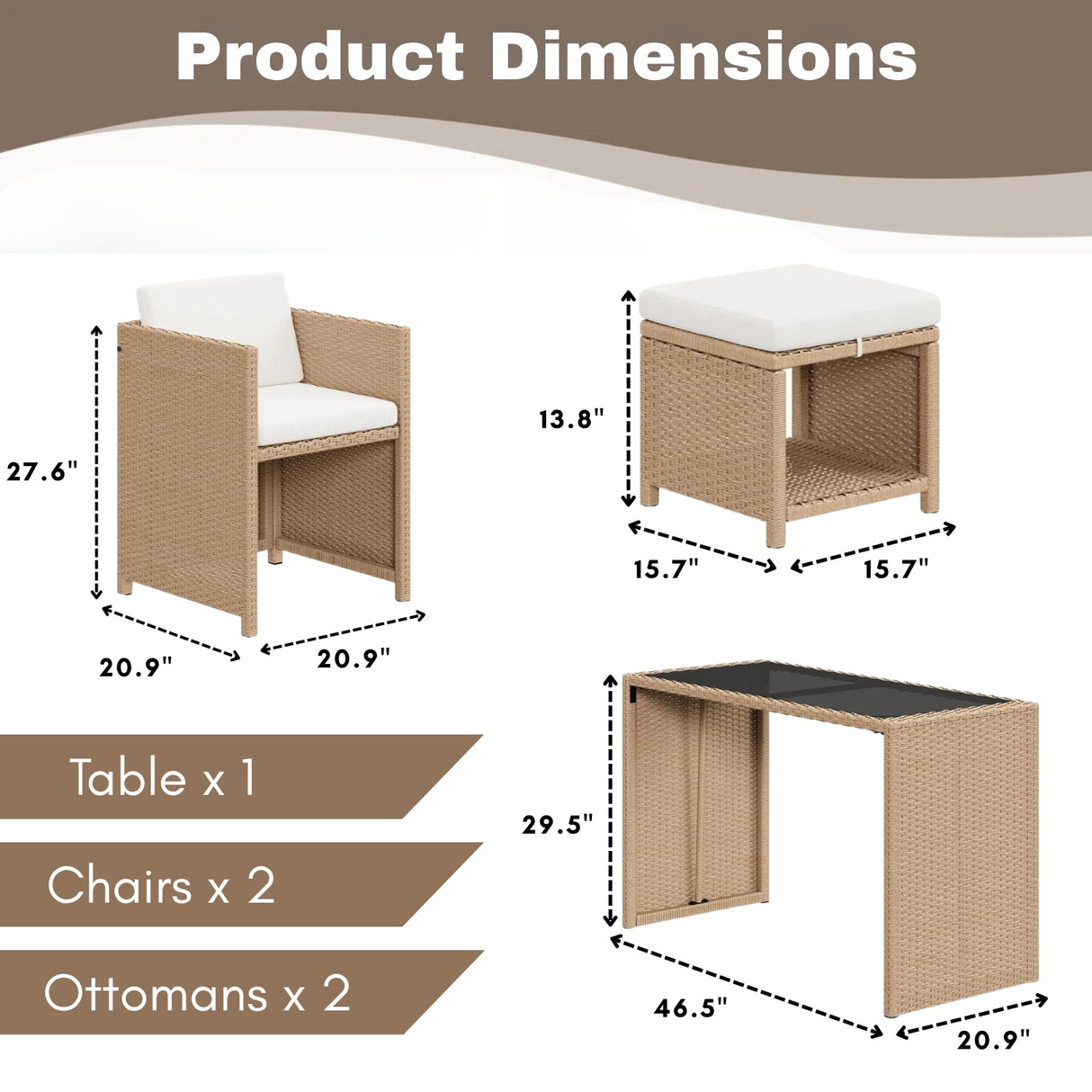 - Compact Ottomans with Cushions : Space-saving ottoman stools tuck neatly under the chairs when not in use and come with soft, water-resistant seat cushions for added comfort.