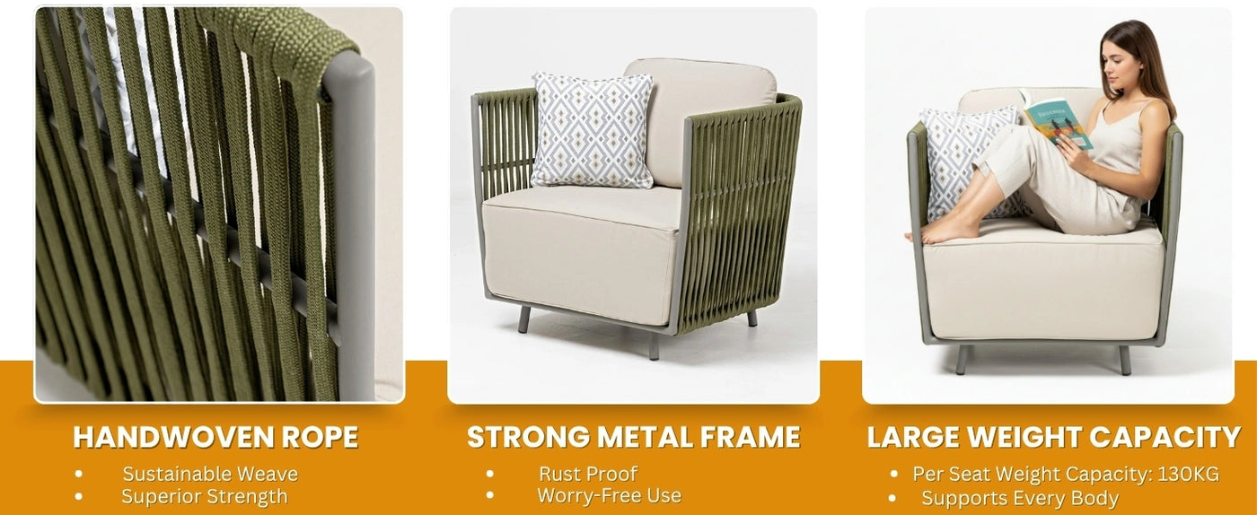 - All-Weather Resistant Materials : Rope, frame, and cushions are designed to resist fading, UV damage, and moisture.