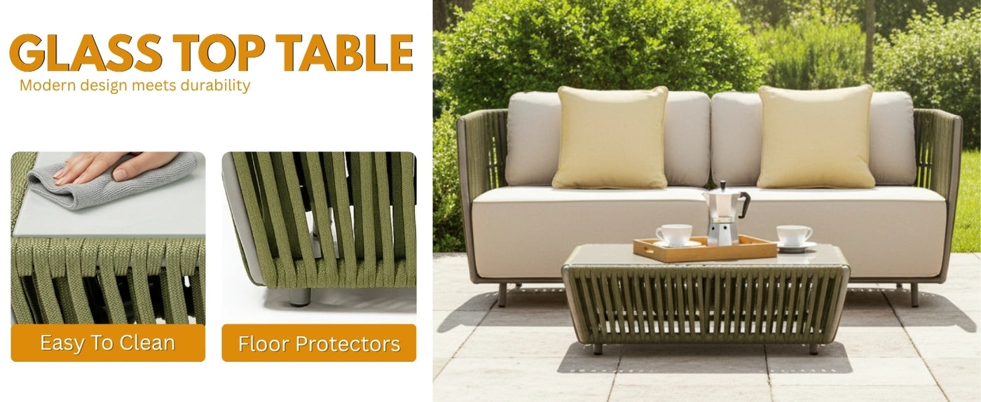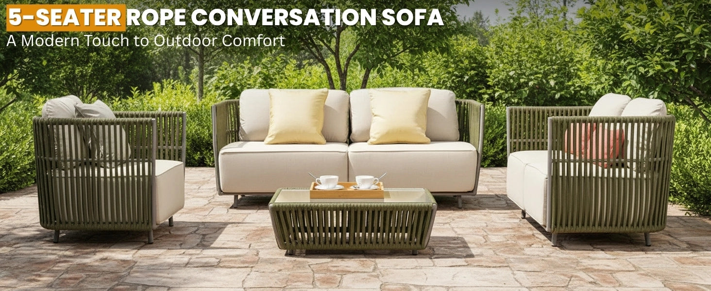 Elevate your outdoor living space with this luxurious 4-piece Outdoor Rope Sofa Set, designed to blend modern aesthetics with ultimate comfort. Crafted with a hand-braided rope design over a durable powder-coated metal frame, this set offers both style and strength to withstand all weather conditions. The 16-inch ultra-thick cushions ensure plush, supportive seating that feels like sinking into a cloud, making it perfect for long hours of relaxation with friends and family. The set includes a spacious 2 double seater sofa, one single seater, and a glass-top center table, providing a complete solution for patios, gardens, balconies, decks, poolside, or terrace setups. The glass tabletop adds a sleek touch while offering a sturdy surface for drinks, snacks, or décor items. Built to endure sun, rain, and varying climates, the braided rope and weather-resistant fabric cushions are designed for long-lasting outdoor performance. With its combination of modern craftsmanship, ergonomic design, and premium materials, this sofa set creates a welcoming lounge space that suits both casual gatherings and elegant outdoor entertaining.