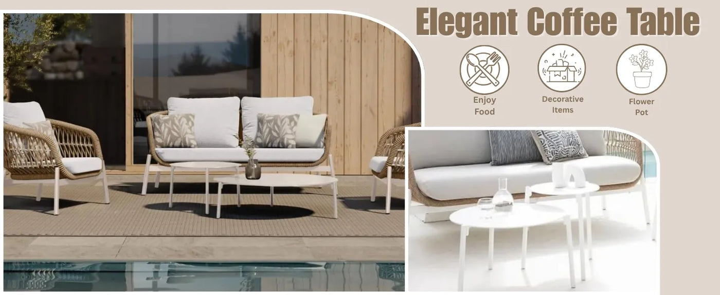 Transform your outdoor space into a serene retreat with this Outdoor 4-Seater Rope Sofa Conversation Set, a perfect blend of modern elegance and functional comfort. Designed for those who love to unwind, entertain, and enjoy nature, this premium set combines sleek aesthetics with durable materials to create a cozy oasis right in your garden, patio, or poolside. Crafted with a sturdy powder-coated metal frame and hand-woven weather-resistant rope, this conversation set is built to withstand sun, rain, and changing seasons without compromising on style. The ergonomic design of the sofa offers excellent lumbar support, while the soft, water-resistant cushions ensure cloud-like comfort for long hours of relaxation. Each cushion features removable, washable covers for easy maintenance, making it ideal for everyday outdoor use. At the heart of the set is a stylish round glass top center & side table both stable and elegant perfect for serving snacks, drinks, or displaying your favorite decor items during outdoor gatherings.