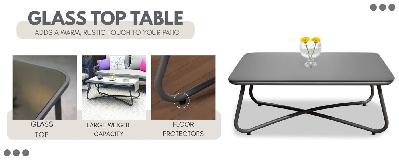 - Functional Center Table with Stylish Appeal : Includes a sturdy matching center table with a tempered glass top, ideal for serving drinks, snacks, or displaying decor. The glass top is easy to clean and adds a sleek, polished finish to the ensemble.