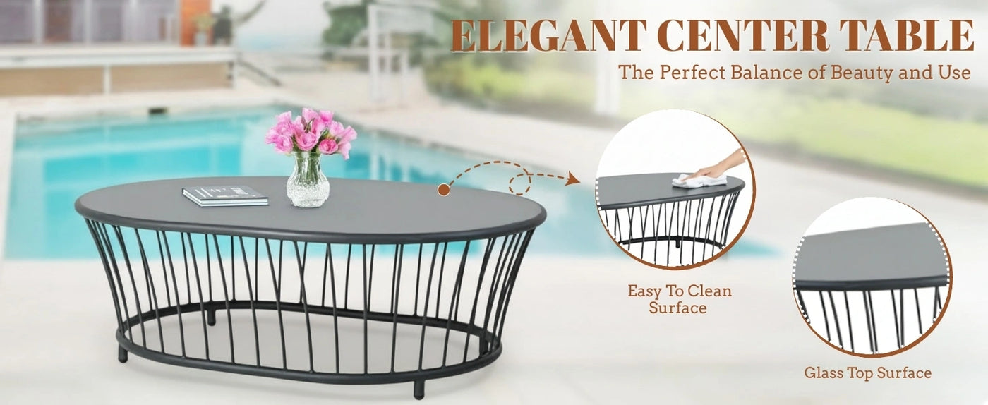Crafted for comfort and built to last, this furniture set is the perfect blend of functionality and contemporary design, making it ideal for your garden, patio, balcony, or poolside. The sofa features premium handwoven rope detailing, supported by a sturdy, rust-resistant powder-coated metal frame that stands up to all weather conditions. The thick, soft all-weather cushions in dark grey provide plush seating comfort and are equipped with washable covers for easy maintenance. Whether you're lounging on a lazy afternoon or hosting guests under the stars, the ergonomic backrest and wide seating ensure maximum relaxation. The set includes a sleek glass-top center table that adds a touch of sophistication while offering ample space for drinks, snacks, or décor. The glass surface is both stylish and easy to clean, making it perfect for everyday outdoor use.