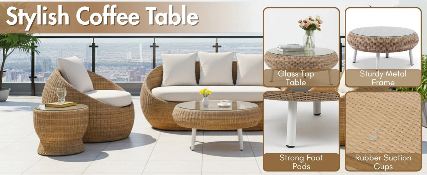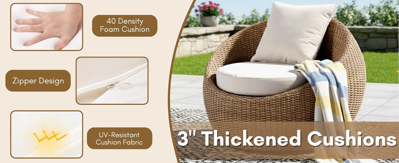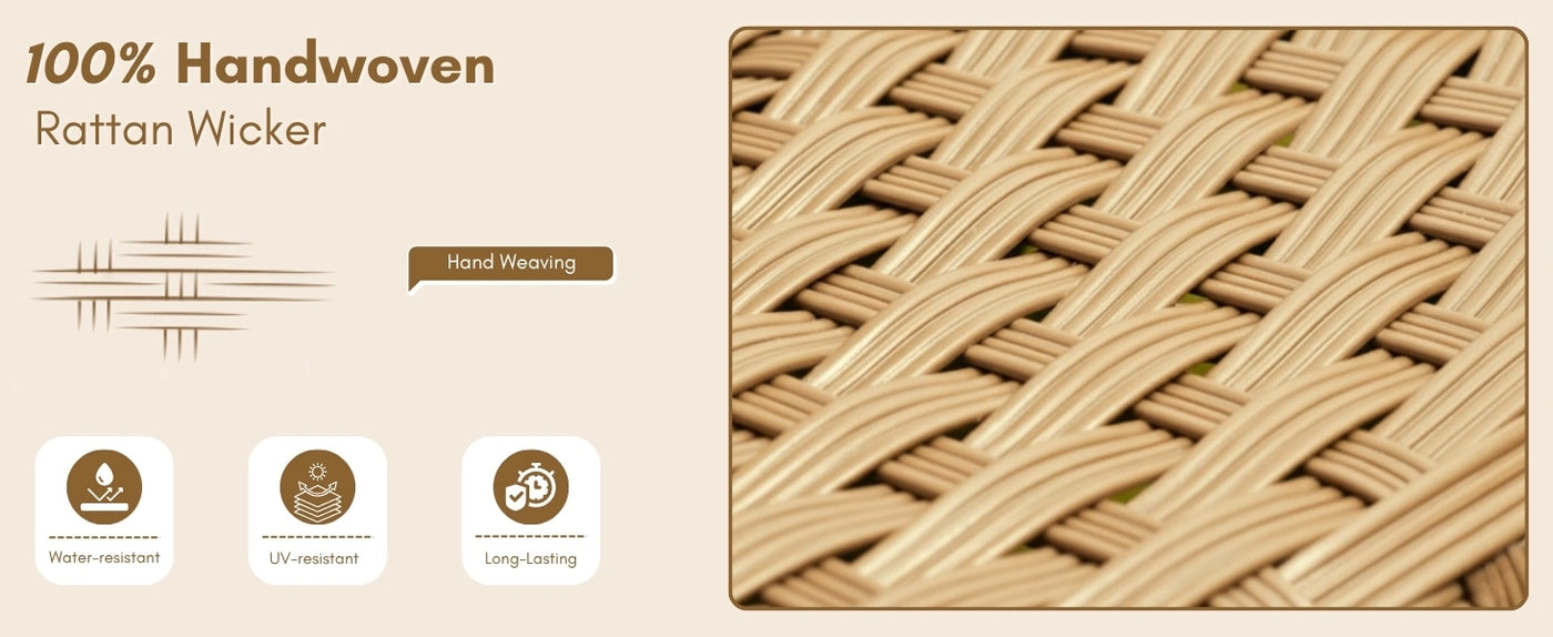 - All-Weather HDPE Wicker : Handwoven UV-resistant wicker offers long-lasting performance in sun, rain, and humidity without cracking or fading.
