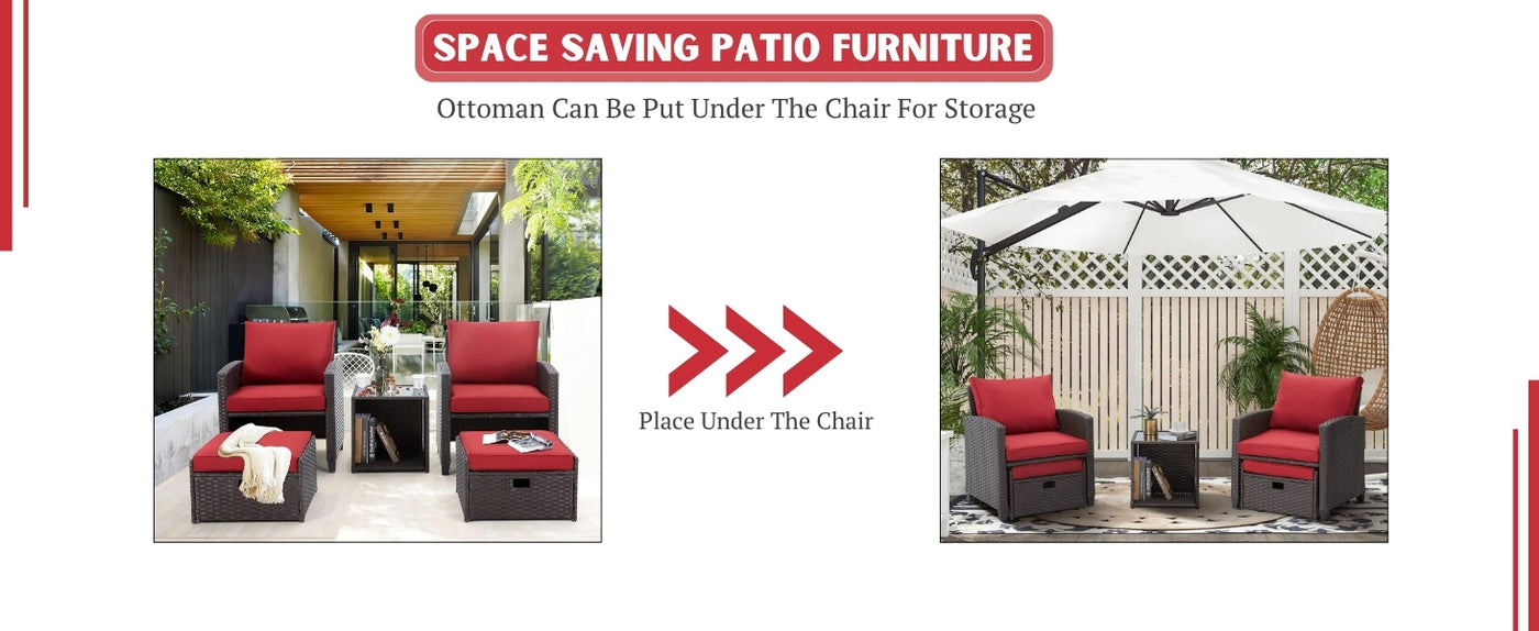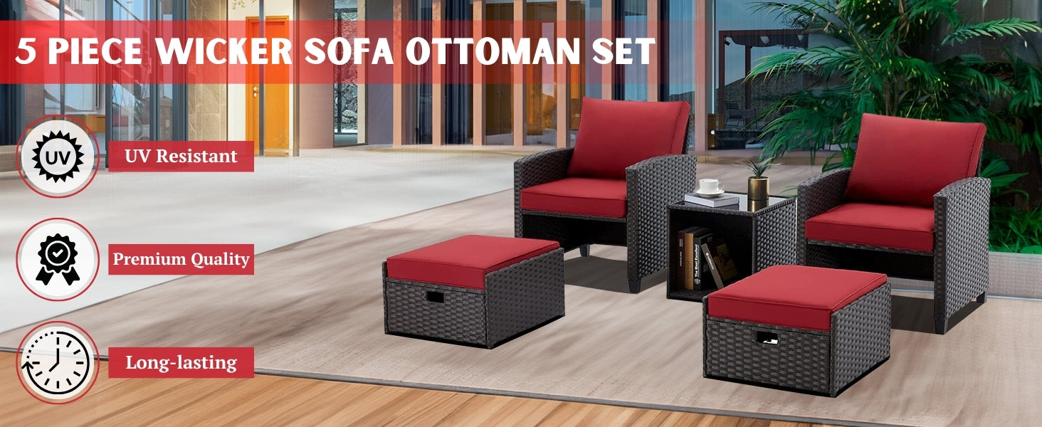 Turn your outdoor space into a cozy retreat with this elegant 5-Piece Patio Furniture Conversation Set. Designed to combine comfort, style, and durability, this bistro-style set is perfect for everything from casual lounging to evening get-togethers. Crafted with premium handwoven all-weather wicker in a rich dark brown finish, it seamlessly complements outdoor décors while withstanding sun, rain, and daily wear. The set includes two cushioned armchairs, two versatile ottomans, and a matching coffee table with a smooth glass top, offering both comfort and practicality. The red-colored cushions add a refreshing contrast and are filled with thick, high-density foam to provide cloud-like relaxation. The removable cushion covers are easy to clean, making maintenance a breeze. Whether you're sipping morning coffee on your porch or entertaining guests by the pool, the ergonomic design of the chairs and the added footrests (which neatly tuck under the chairs when not in use) ensure a perfect balance of luxury and function. The lightweight yet sturdy powder-coated frame ensures long-lasting performance without compromising portability. Make your outdoors an extension of your home this 5-piece conversation set offers the ideal blend of charm, convenience, and comfort for any season.