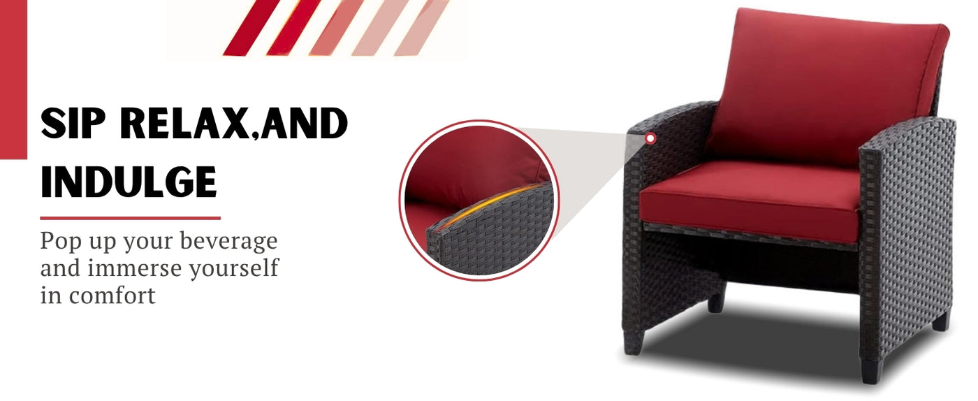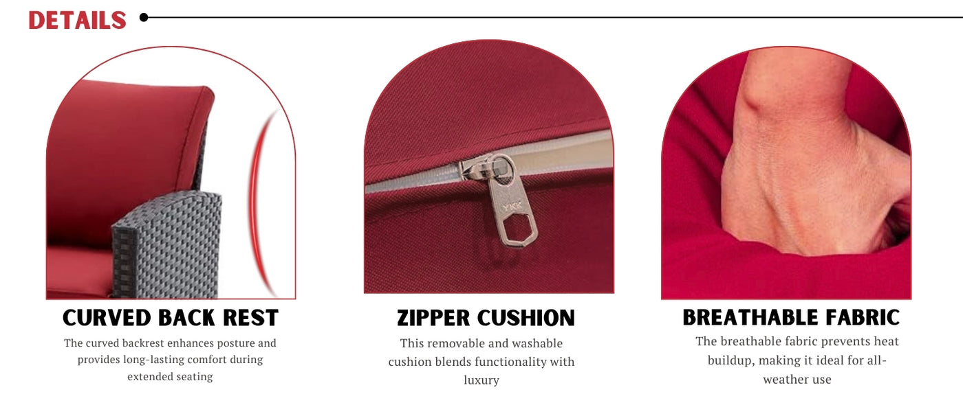 • Plush Red Cushions with Zippers : 3” thick seat cushions provide soft, supportive comfort during long sitting sessions. Water-resistant, removable covers are easy to clean and maintain for outdoor durability.