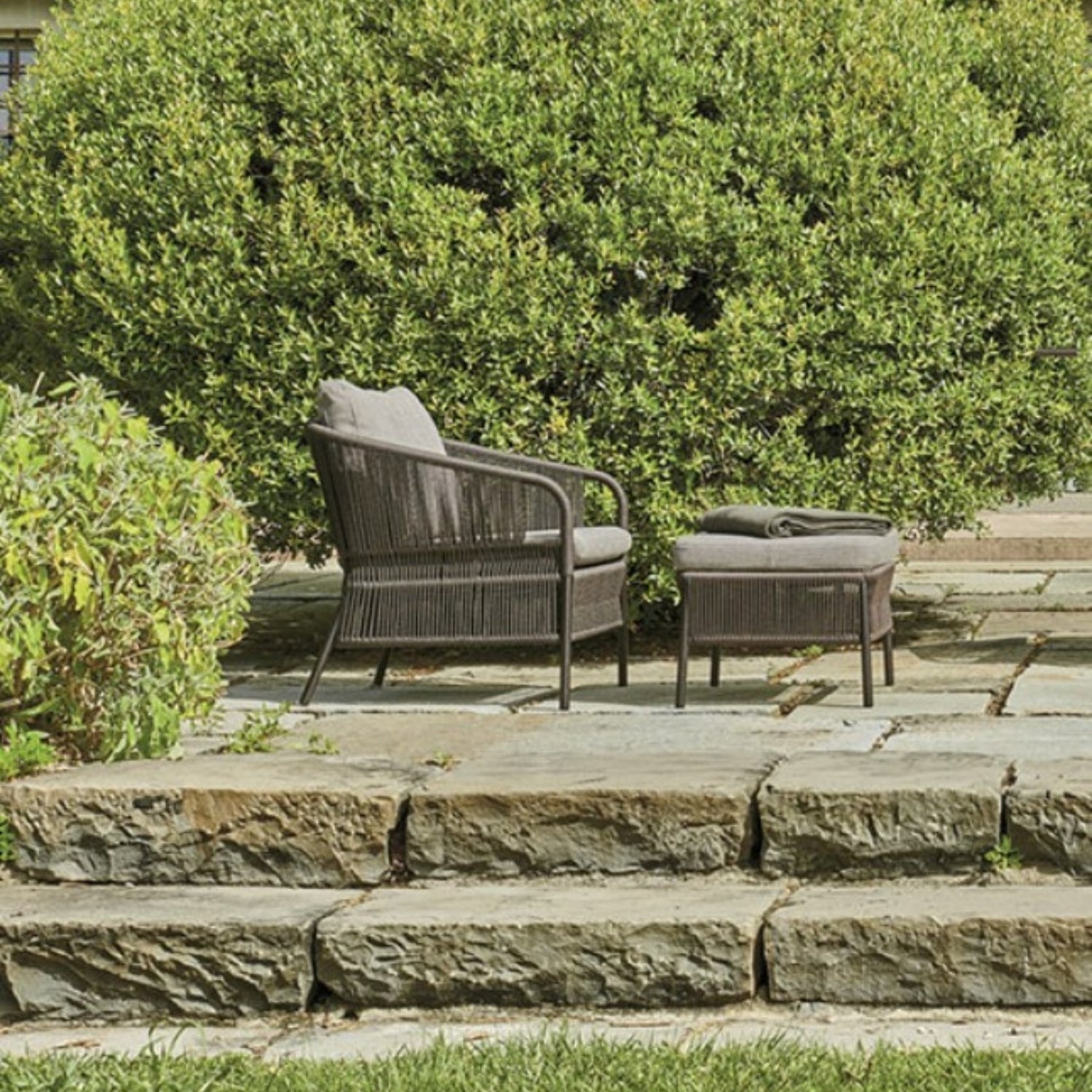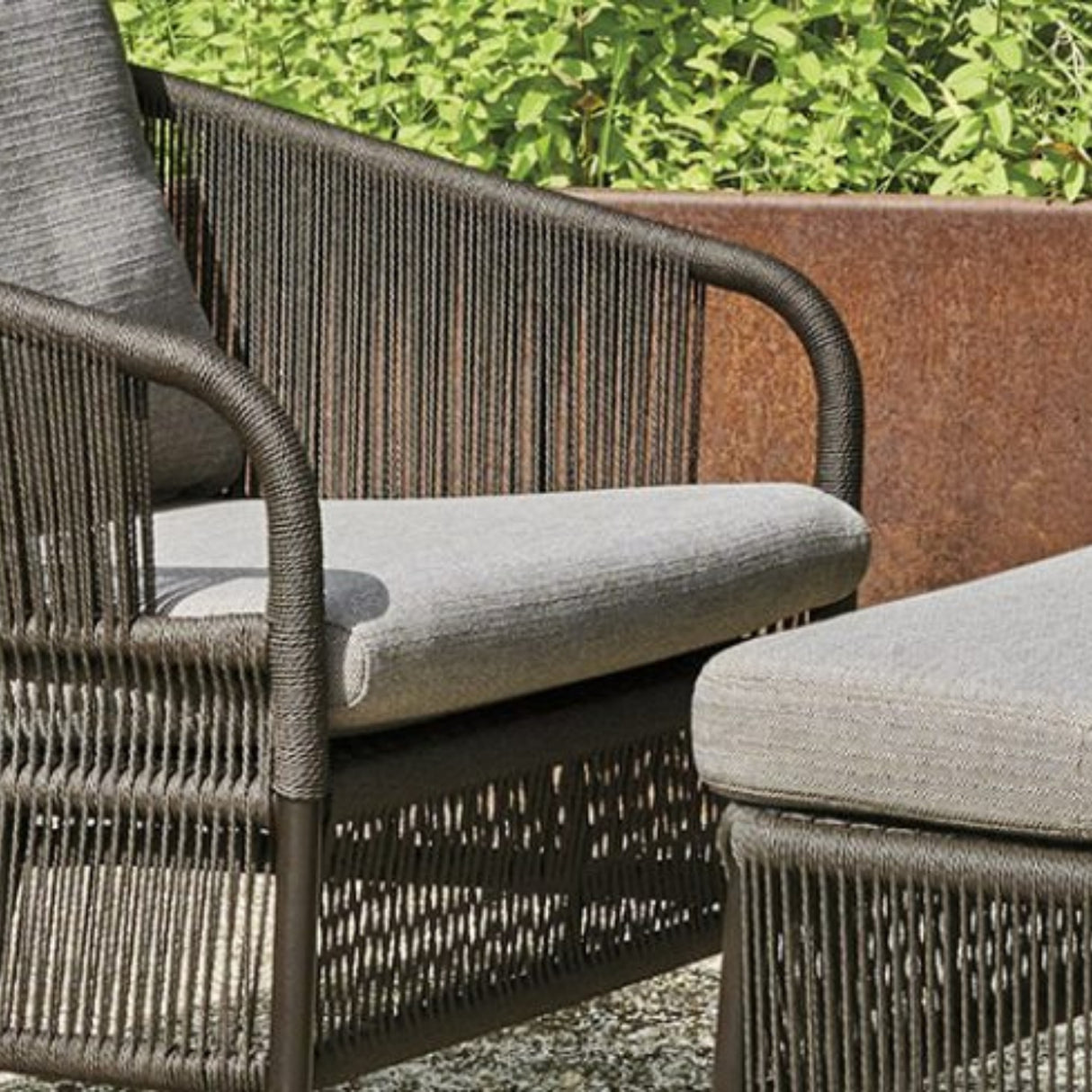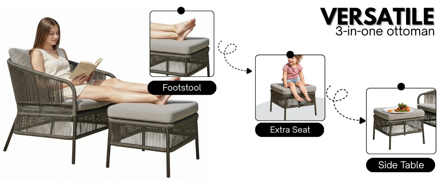 Create your personal sanctuary of style and comfort with this 2 Piece Rope Conversation Patio Set, thoughtfully designed to enhance any indoor or outdoor space. Whether it’s your balcony, garden, backyard, terrace, or sunroom, this versatile set transforms any corner into a relaxing retreat. Crafted with a modern grey finish, this elegant ensemble includes one armchair & matching ottoman. The frame is constructed from durable powder-coated metal for long-lasting stability, while the handwoven all-weather rope offers superior strength, breathability, and visual appeal. The ottoman adds multi-functionality use it as a footrest, extra seating, or a makeshift side table. The plush, removable cushions are made with water-resistant fabric and filled for ultimate comfort, making every lounging experience feel luxurious.