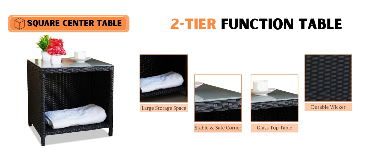 - Glass Coffee Table : Stylish and functional center table with a scratch-resistant, easy-to-clean glass top great for serving drinks, snacks, or décor in any outdoor setting.