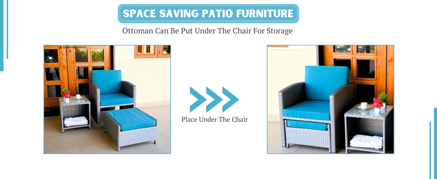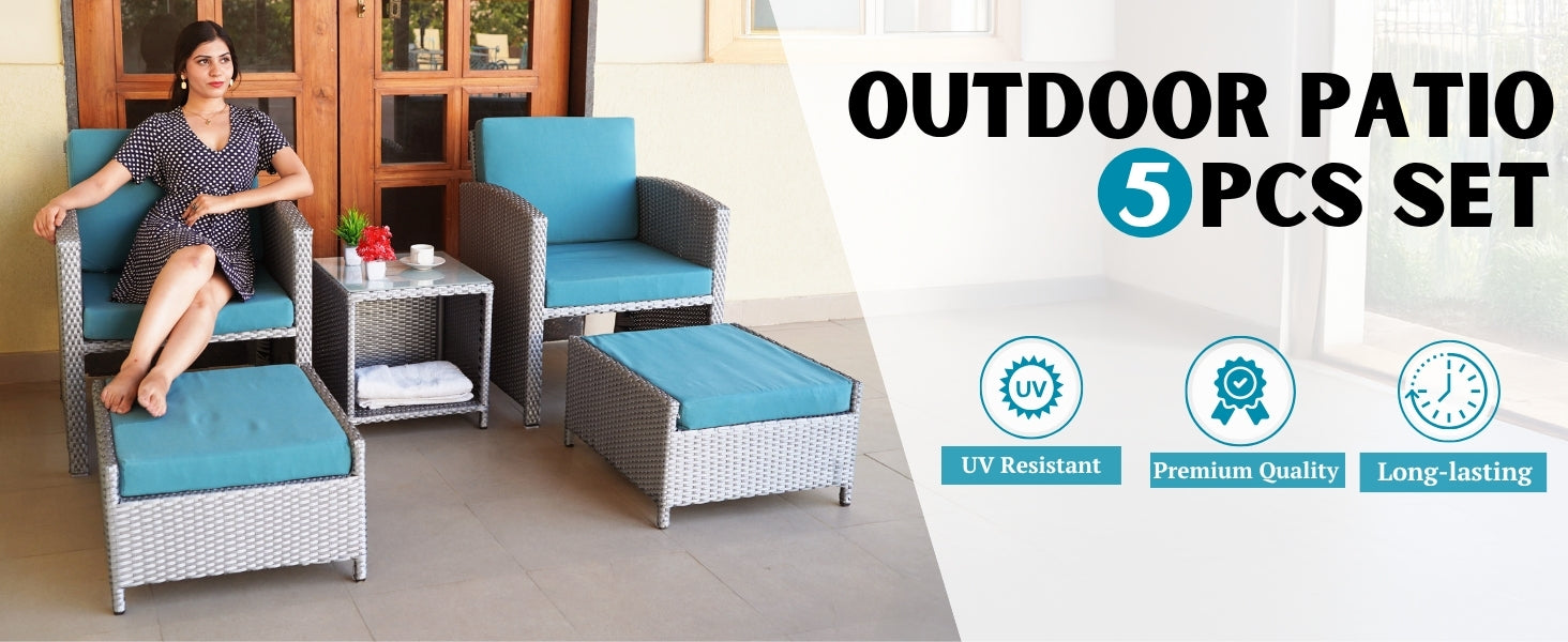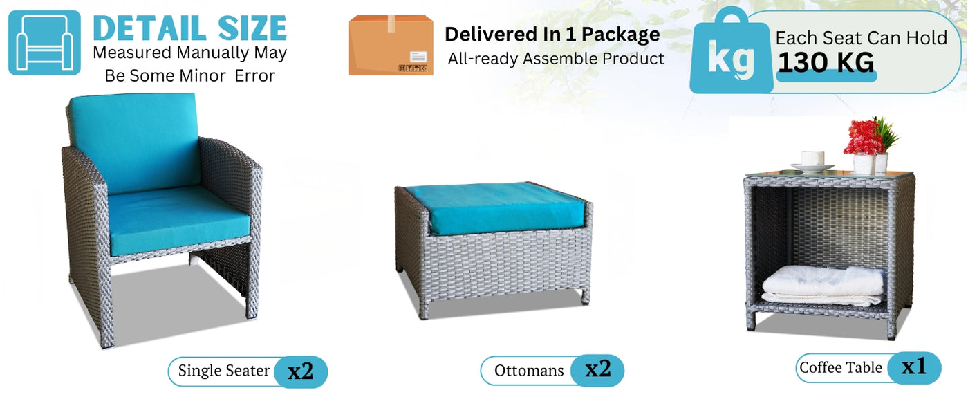 Transform your outdoor space into a stylish and relaxing retreat with this 5 Piece Patio Wicker Sectional Conversation Set. Designed for comfort, durability, and visual appeal, this versatile set includes cushioned chairs, ottomans, and a matching center table perfect for hosting friends or unwinding with family in the fresh air. Whether it's a sun-soaked garden, a breezy poolside, or a cozy porch corner, this all-weather set brings comfort and charm to every setting. Crafted with high-quality handwoven wicker over a rust-resistant powder-coated metal frame, this furniture is built to withstand the elements sun, rain, or wind without fading or weakening. The plush, water-resistant cushions in elegant silver grey and sky-blue tones offer cloud-like comfort, and the removable covers make cleaning a breeze. The multifunctional ottomans can be used as footrests, extra seats, or tucked under the chairs for space-saving convenience, giving your setup added flexibility and style. Whether you're enjoying a morning coffee, entertaining guests, or relaxing after a long day, this sectional set delivers both luxury and practicality. The neutral color palette blends effortlessly with any outdoor décor, while the compact design makes it ideal for balconies and smaller patios too.