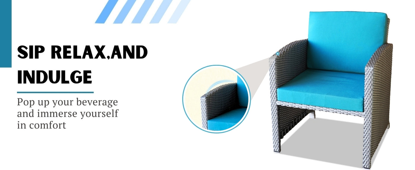 - Comfortable Water Resistant Cushions : Comes with thick, soft, and supportive cushions in elegant silver grey & sky-blue, featuring water-resistant covers that are removable and easy to wash for stress-free maintenance.